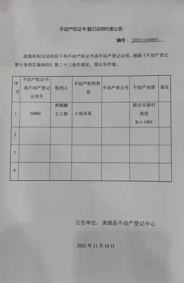 涞源县不动产登记中心不动产权证书登记证明作废公告