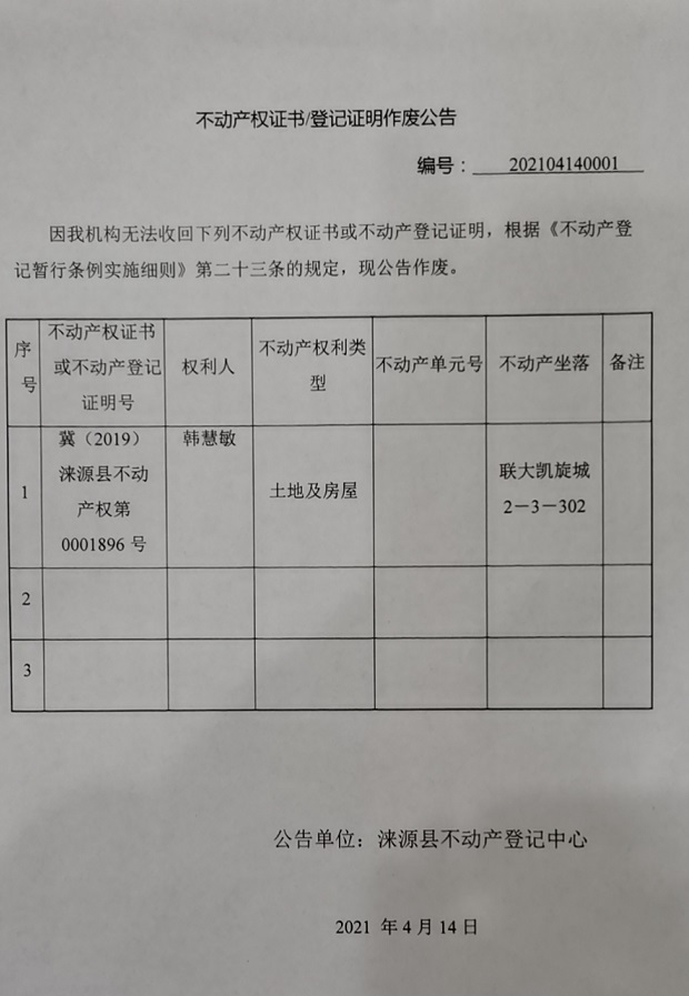 涞源县不动产登记中心公告