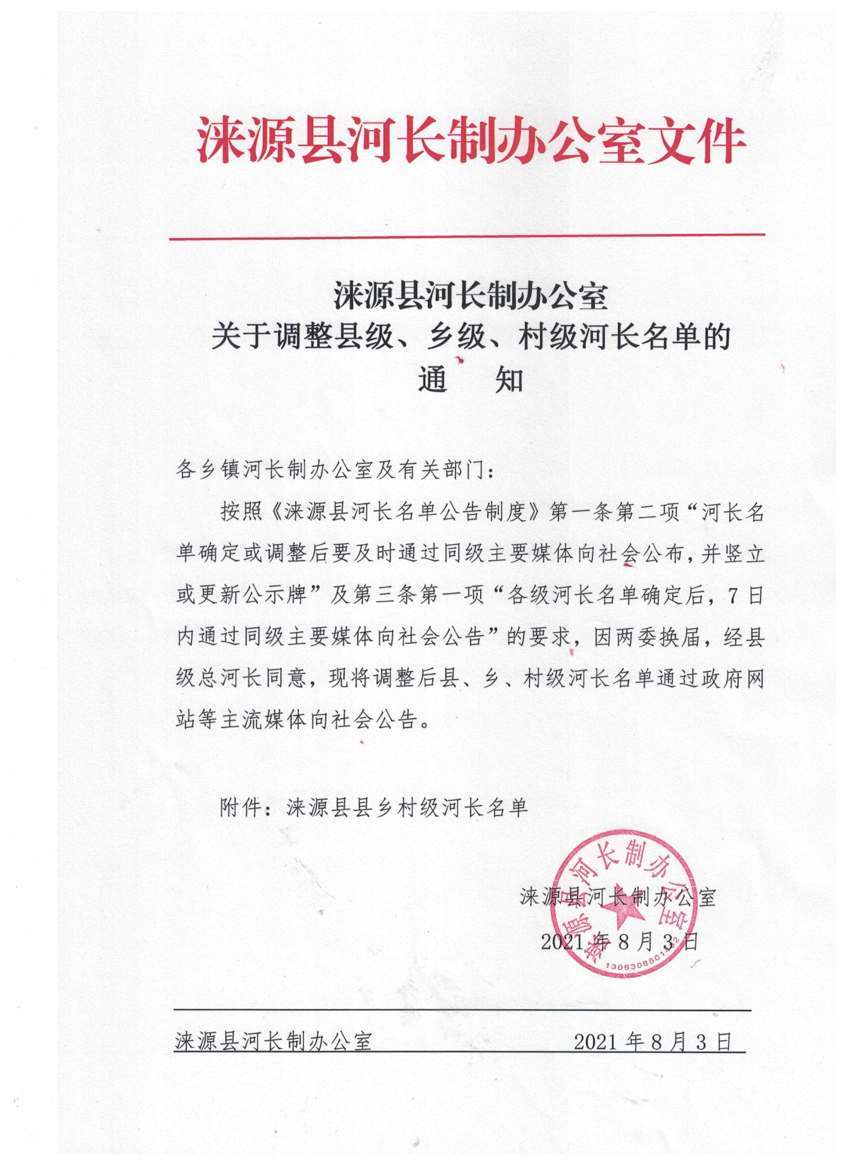 | 涞源县河长制办公室关于调整县级、乡级、村级河长名单 | ||||