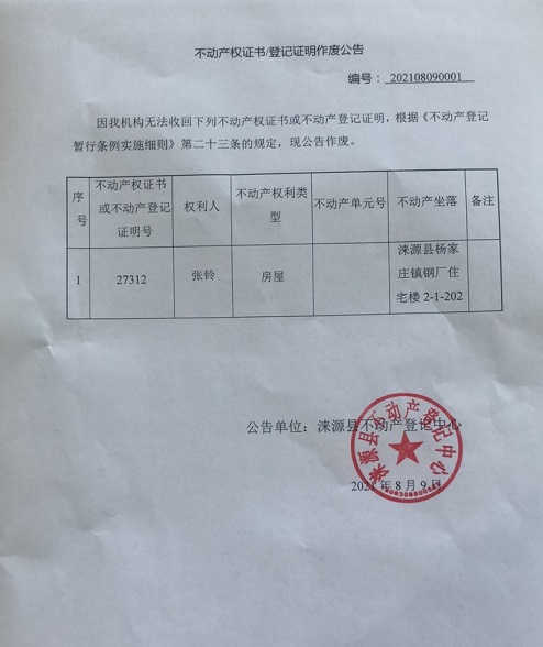 涞源县不动产登记中心不动产权证书登记证明作废公告