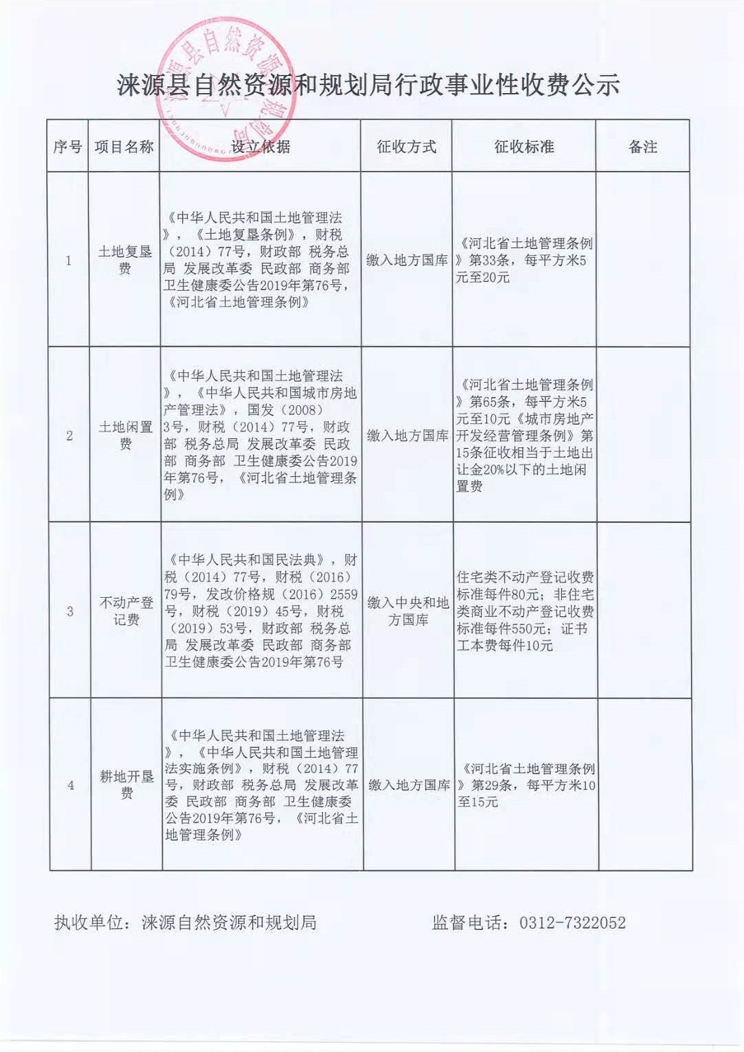 | 涞源县自然资源和规划局执行的全国性行政事业性收费公示 | ||||