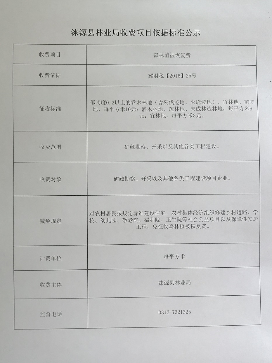 | 名 称: | 涞源县林业局收费项目依据标准公示 | ||||
