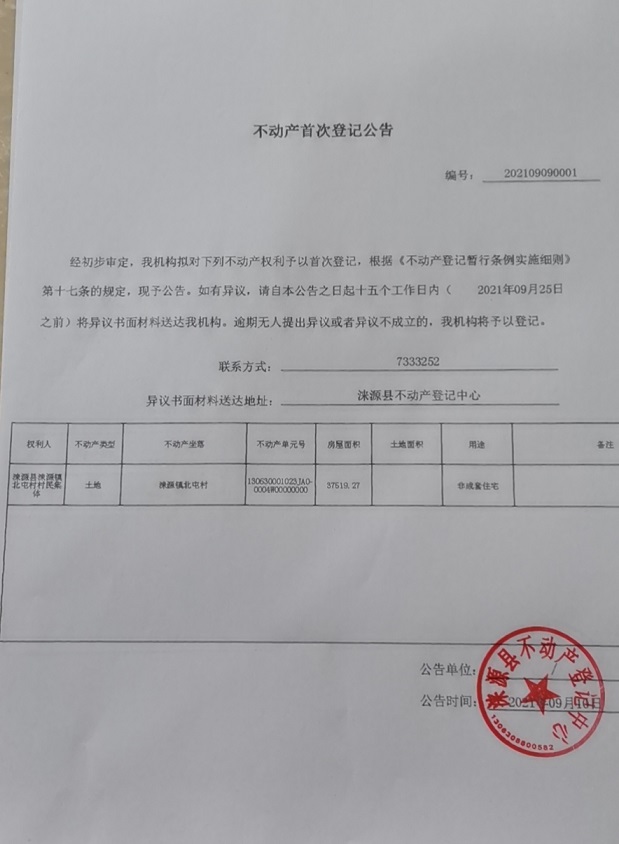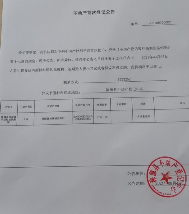 涞源县不动产登记中心《不动产首次登记公告》