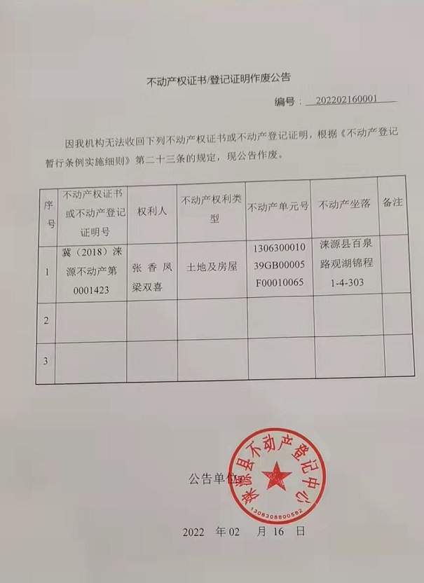 涞源县不动产权证书登记证明作废公告