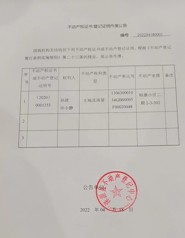 涞源县不动产登记中心不动产权证书登记证明作废公告