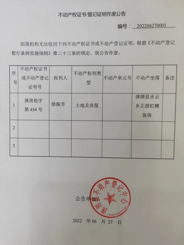 涞源县不动产登记中心不动产权证书登记证明作废公告
