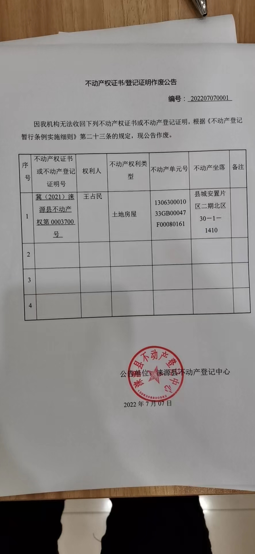 涞源县不动产权证书/登记证明作废公告
