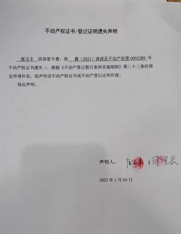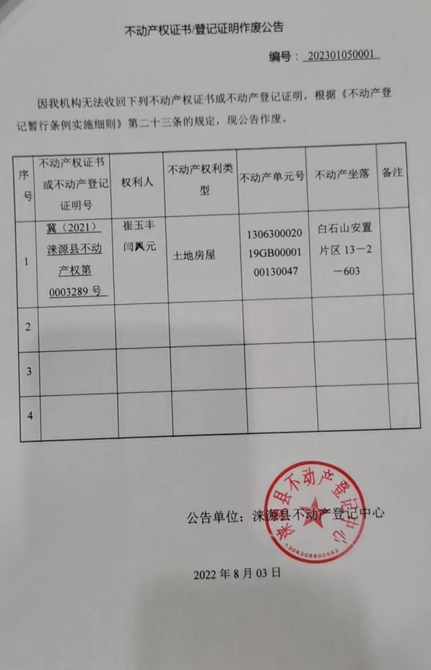 涞源县不动产登记中心不动产权证书登记证明作废公告