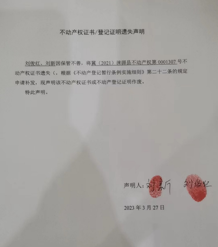 涞源县不动产登记中心不动产权证书遗失声明