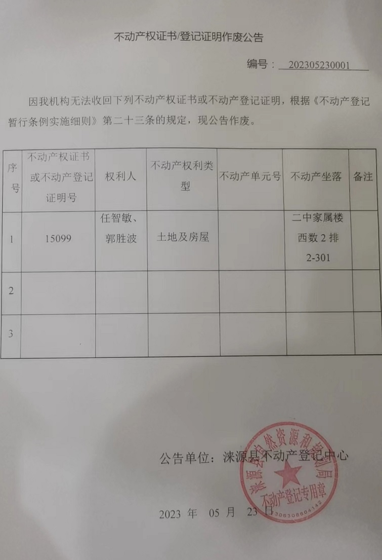 涞源县不动产登记中心不动产权证书作废公告