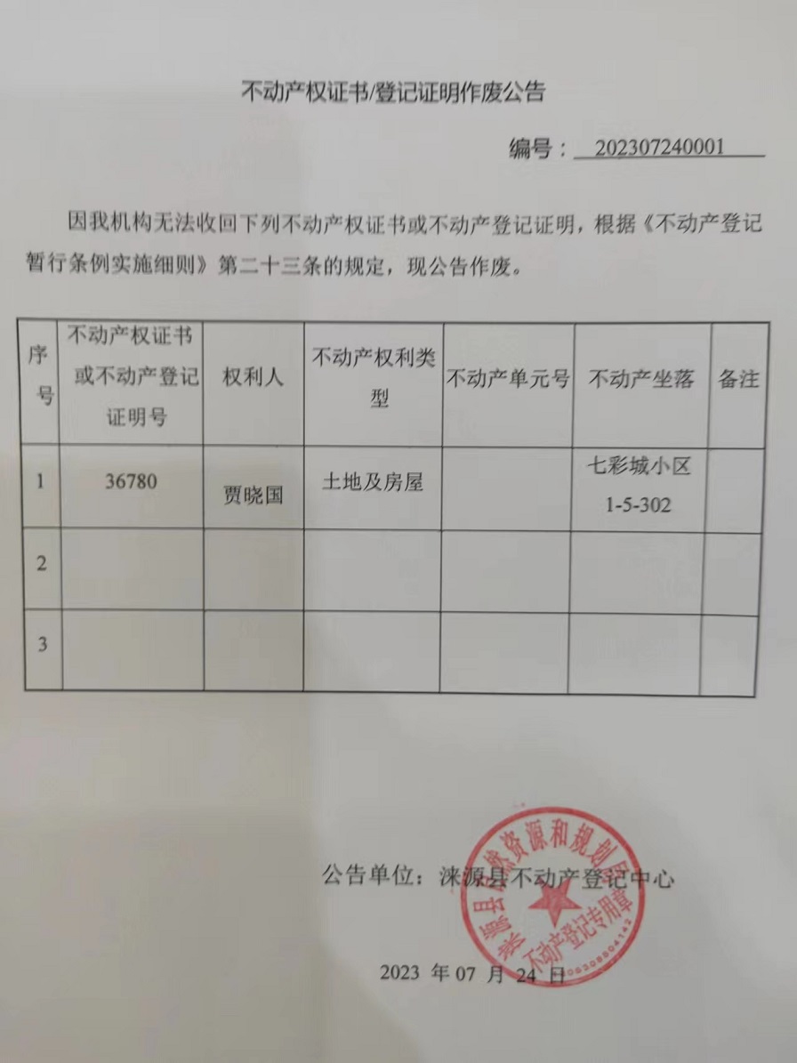 涞源县不动产登记中心不动产权证书作废公告