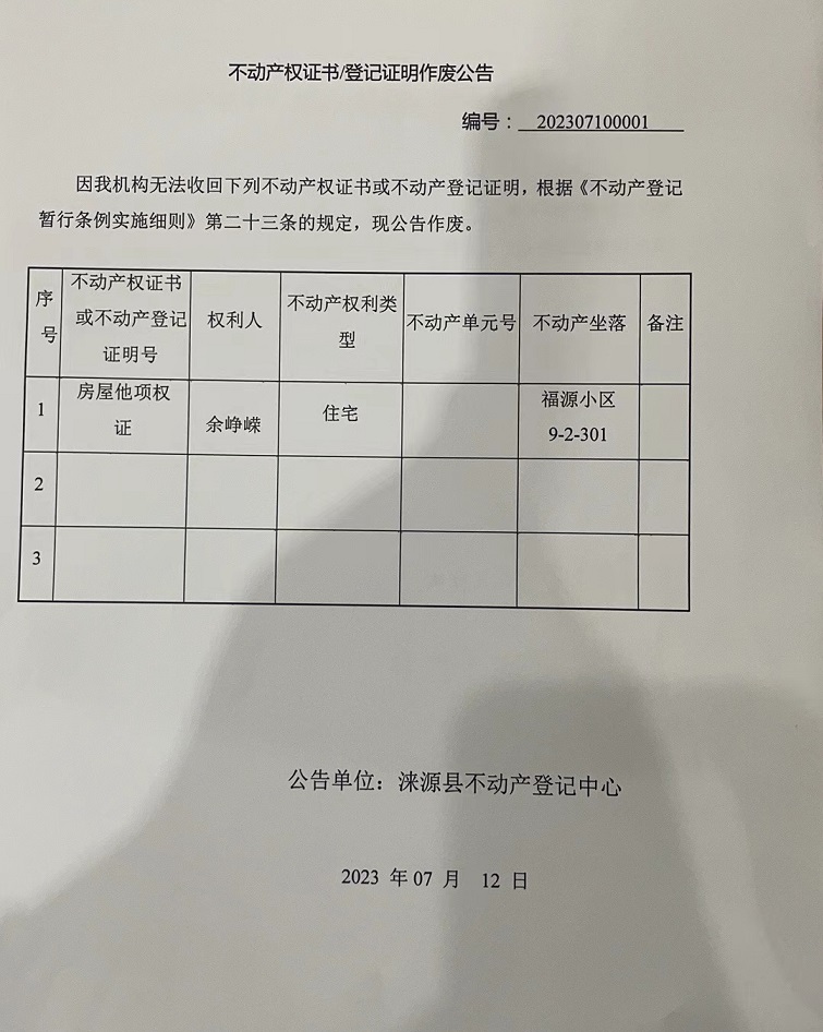 涞源县不动产登记中心不动产权证书作废公告