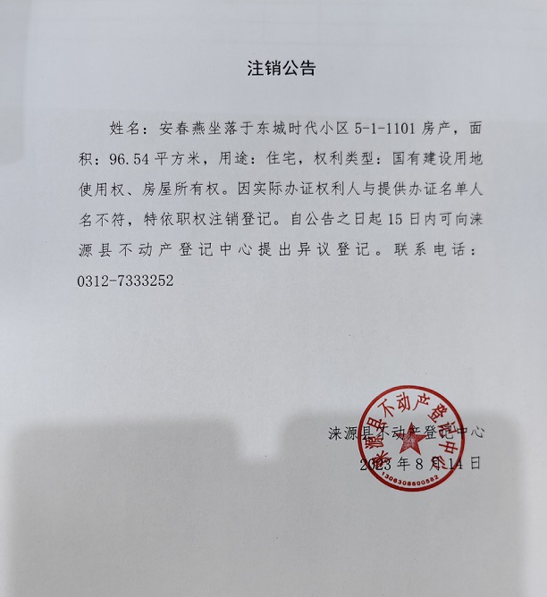 涞源县不动产登记中心注销公告