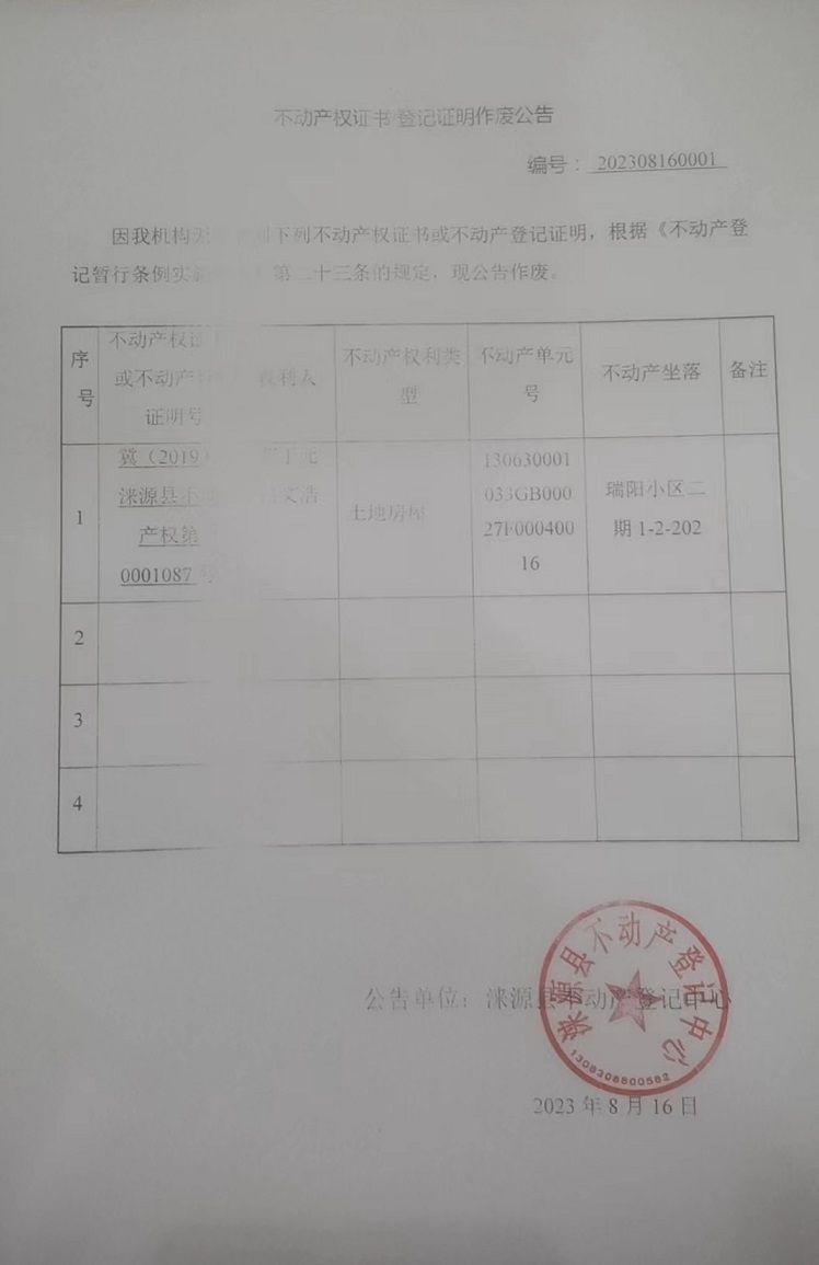 涞源县不动产登记中心不动产权证书作废公告