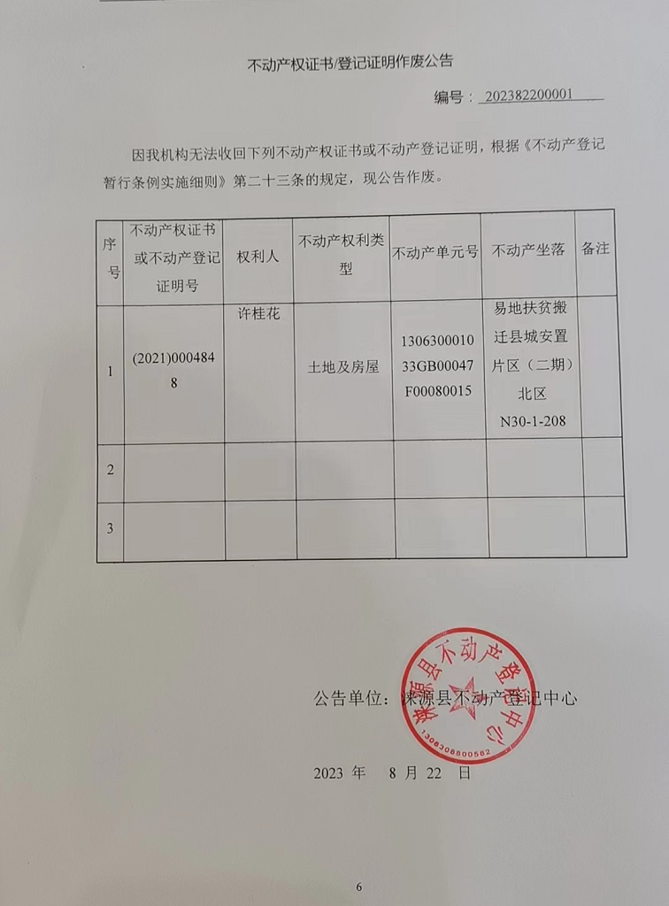 涞源县不动产登记中心不动产权证书作废公告