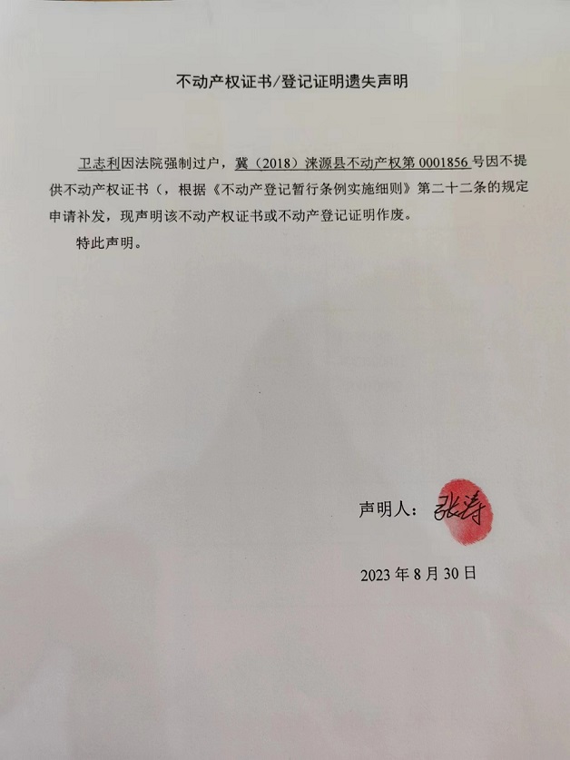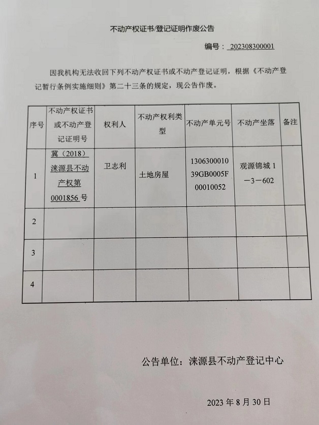 涞源县不动产登记中心不动产权证书作废公告