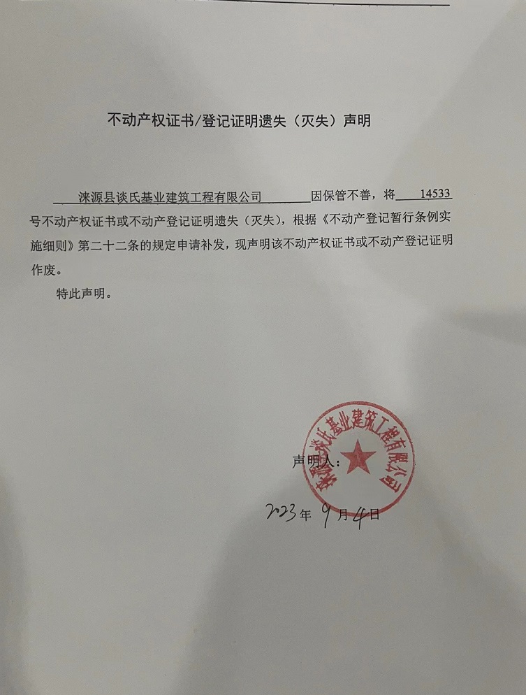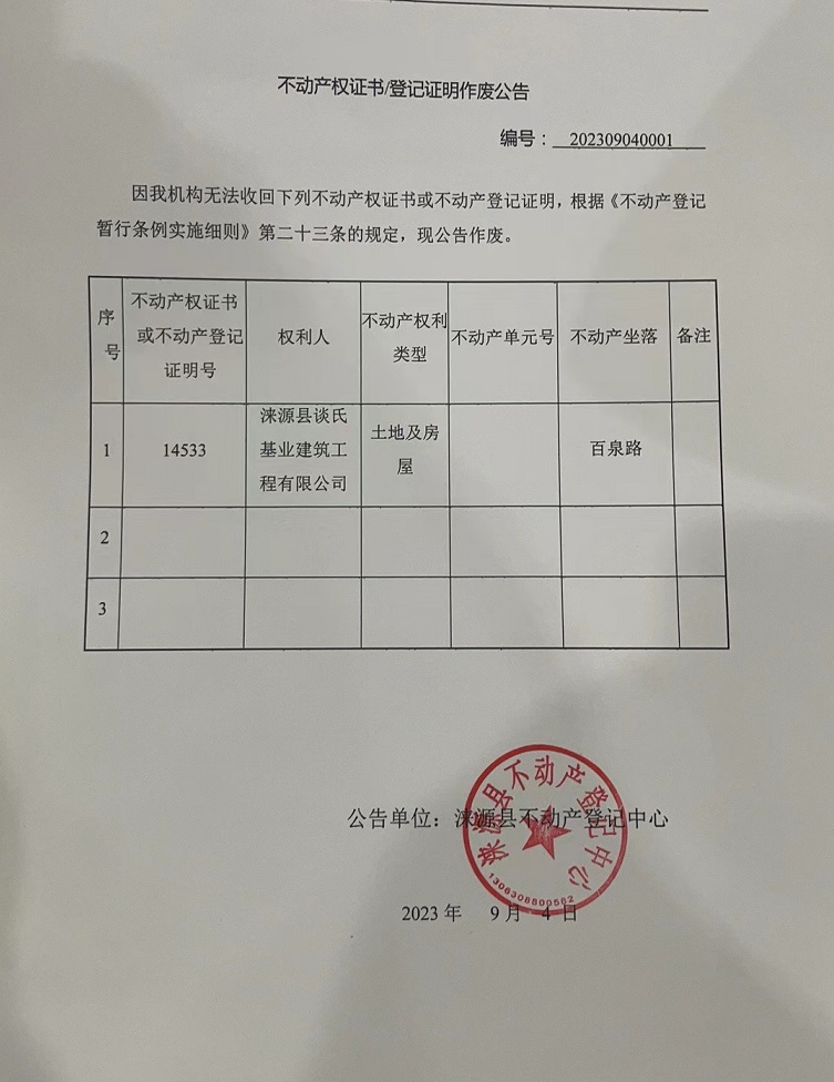 涞源县不动产登记中心不动产权证书作废公告