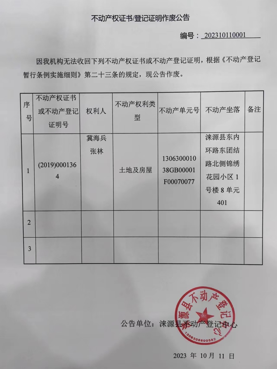 涞源县不动产登记中心不动产权证书作废公告