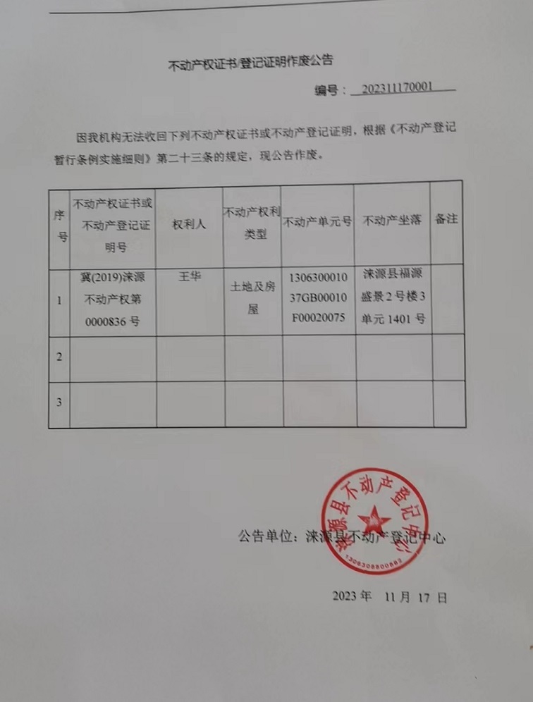 涞源县不动产登记中心不动产权证书作废公告