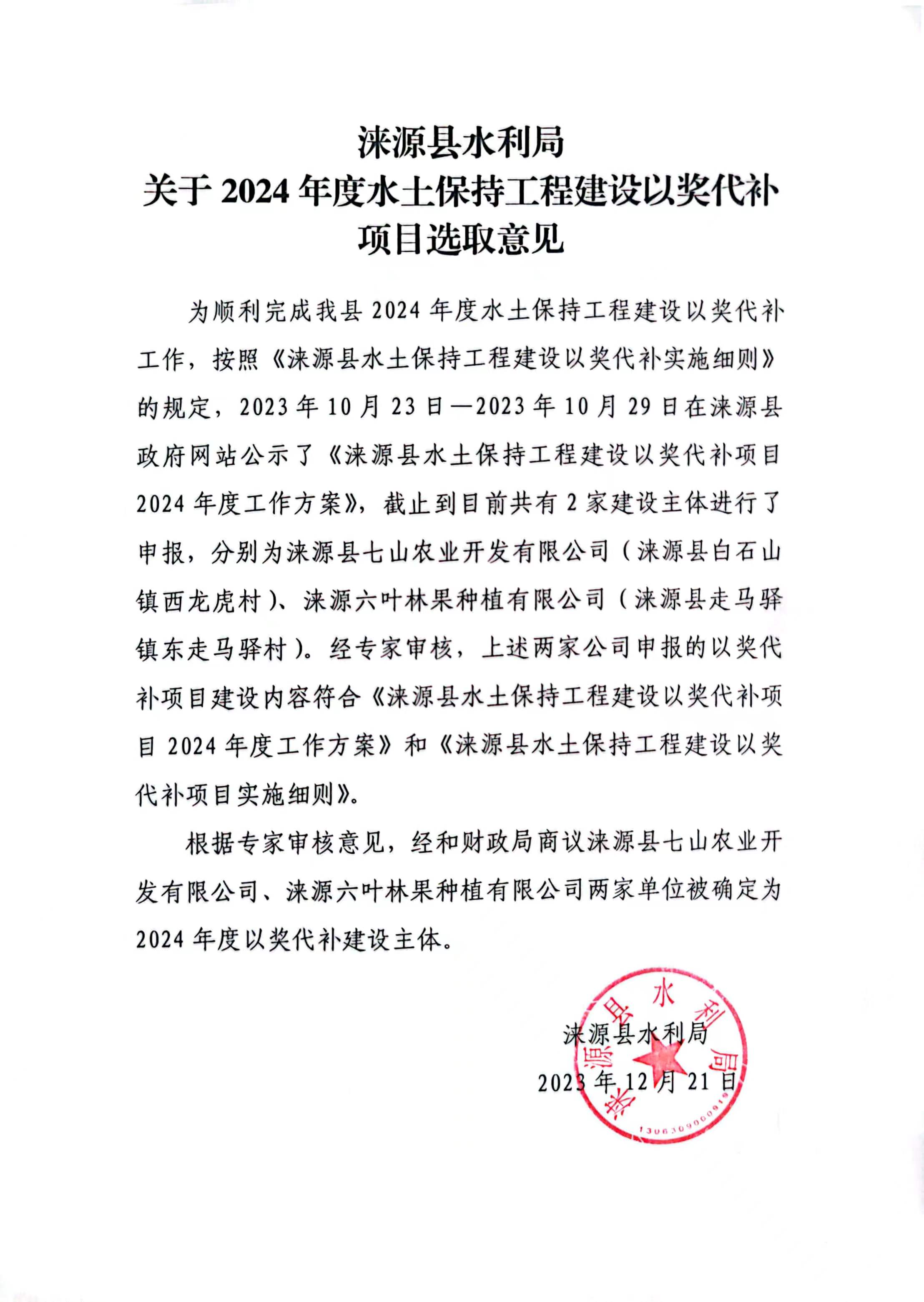 涞源县水利局关于2024年度水土保持工程建设以奖代补项目选取意见