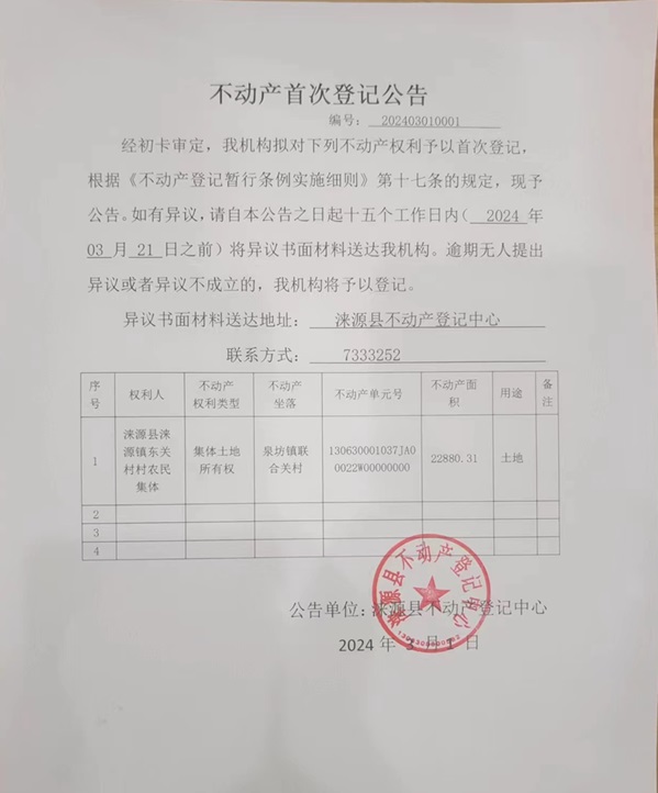 涞源县不动产登记中心不动产首次登记公告