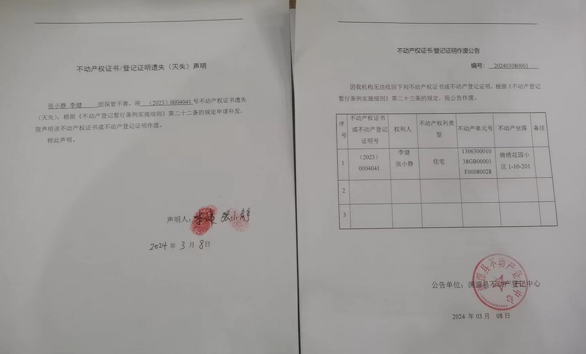 涞源县不动产登记中心不动产权证书作废公告