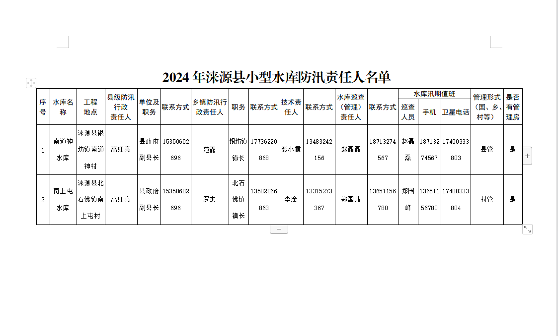 2024年涞源县小型水库防汛责任人名单