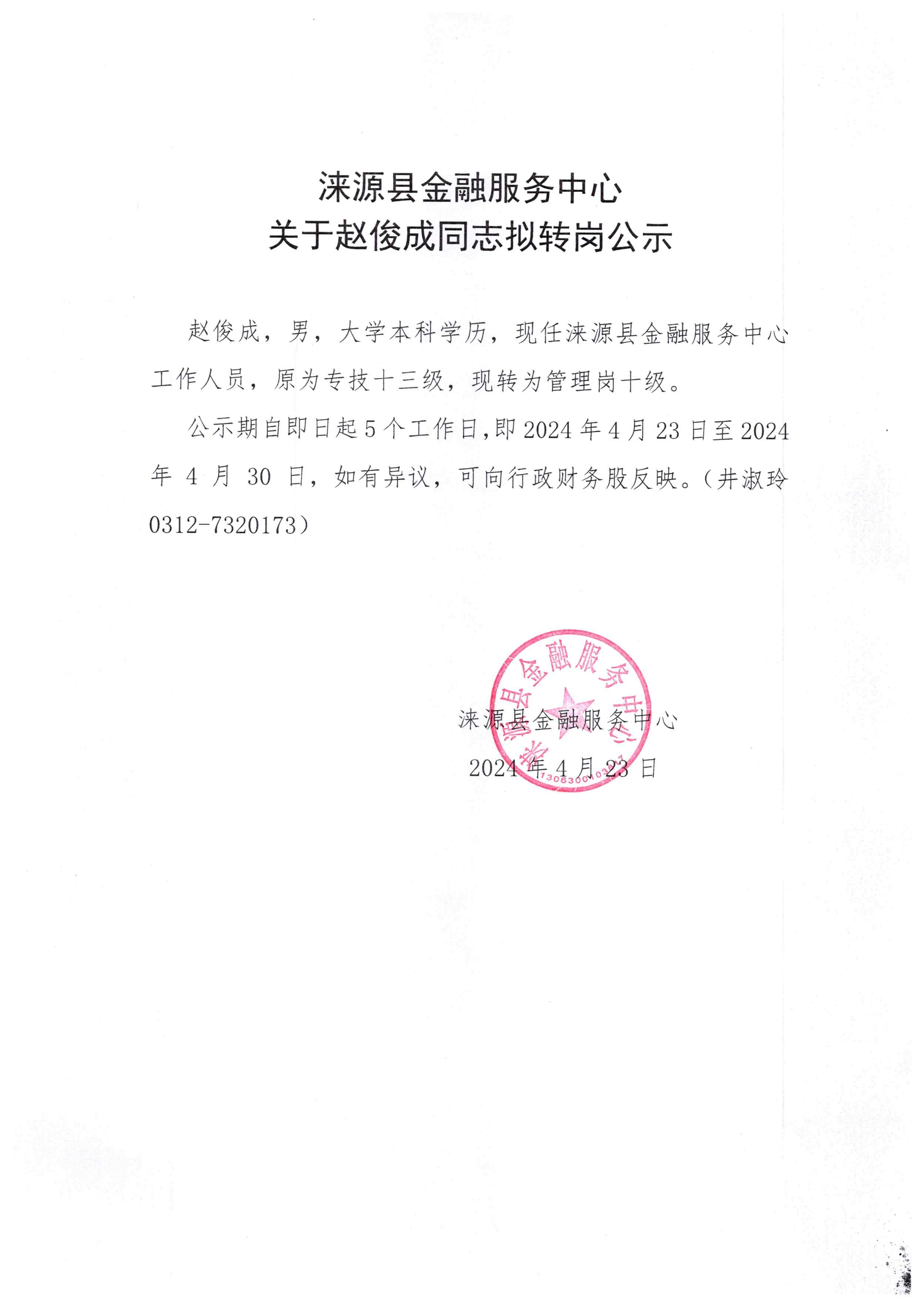 涞源县金融服务中心关于赵俊成同志拟转岗公示