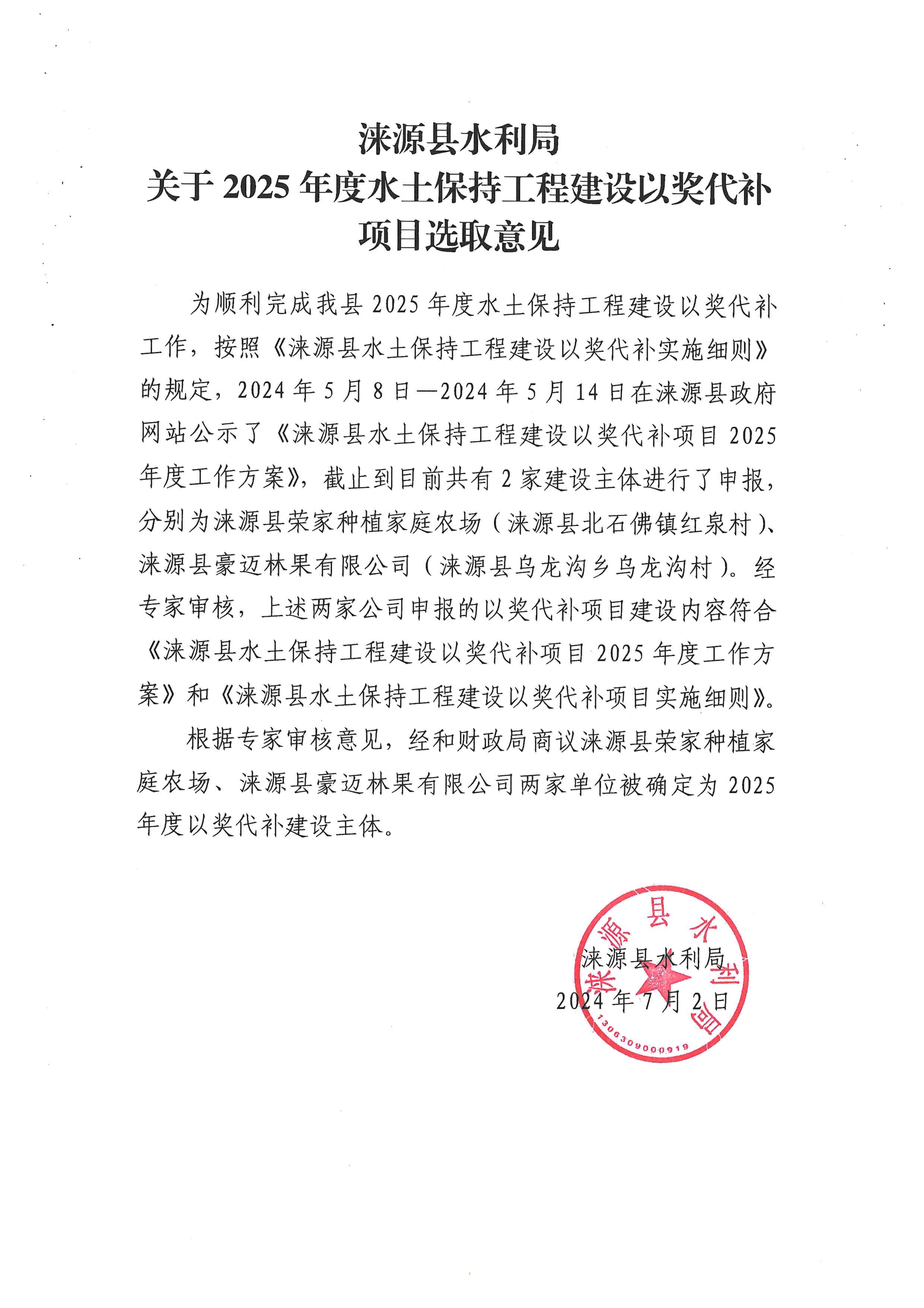 涞源县水利局关于2025年度水土保持工程建设以奖代补项目选取意见