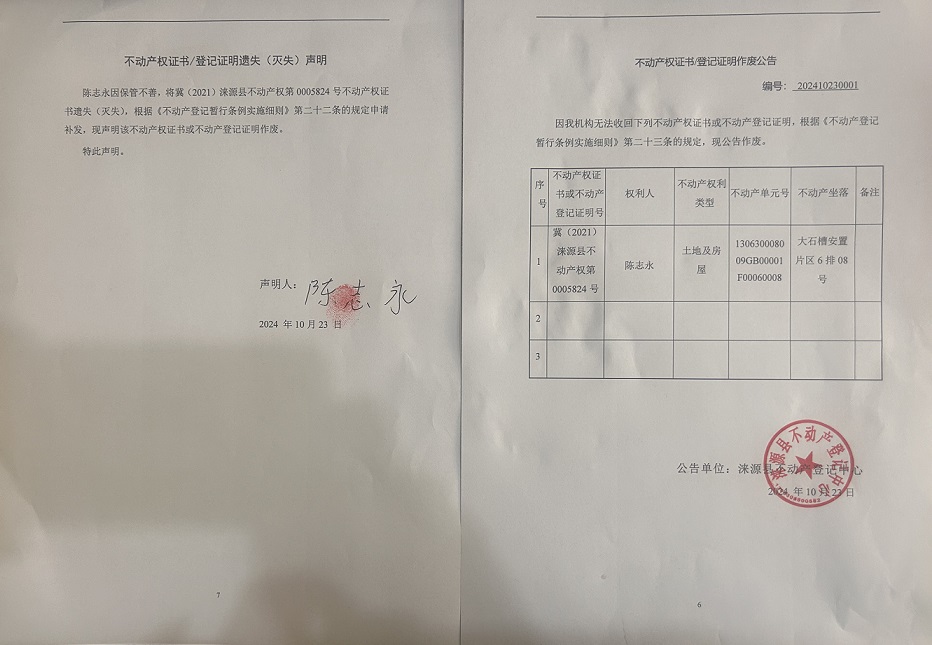 涞源县不动产登记中心不动产权证书作废公告