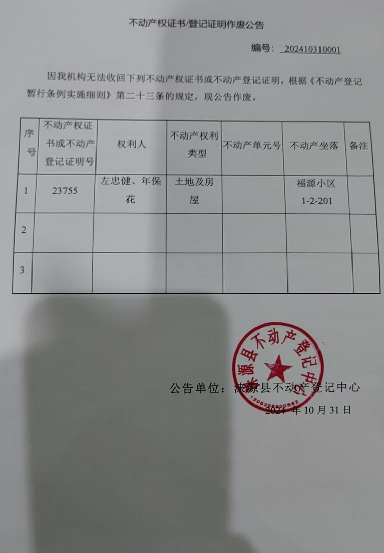 涞源县不动产登记中心不动产权证书作废公告