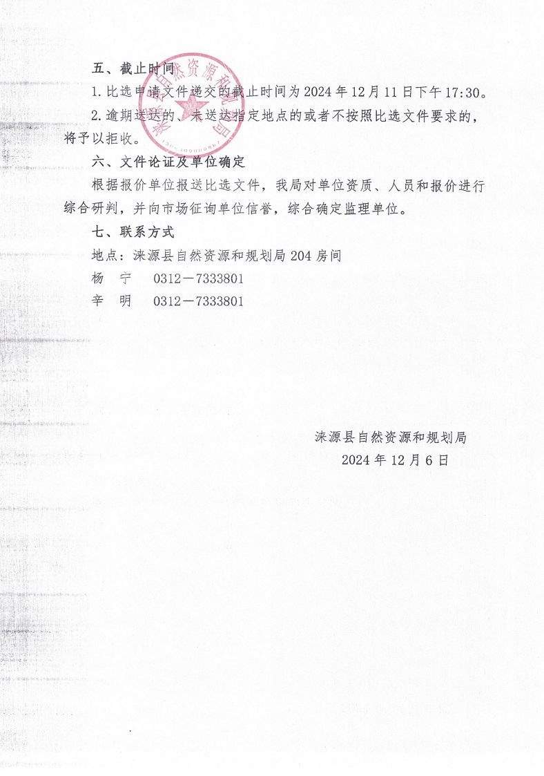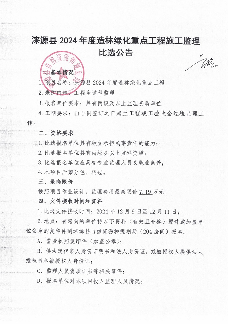 涞源县2024年度造林绿化重点工程施工监理比选公告
