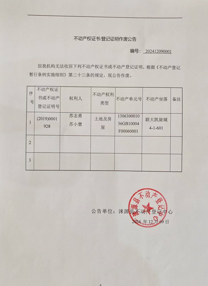 涞源县不动产登记中心不动产权证书作废公告