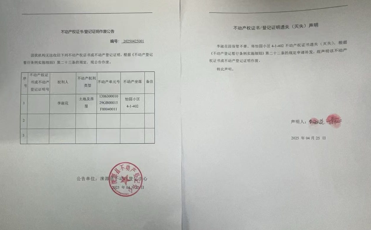 涞源县不动产登记中心不动产权证书作废公告