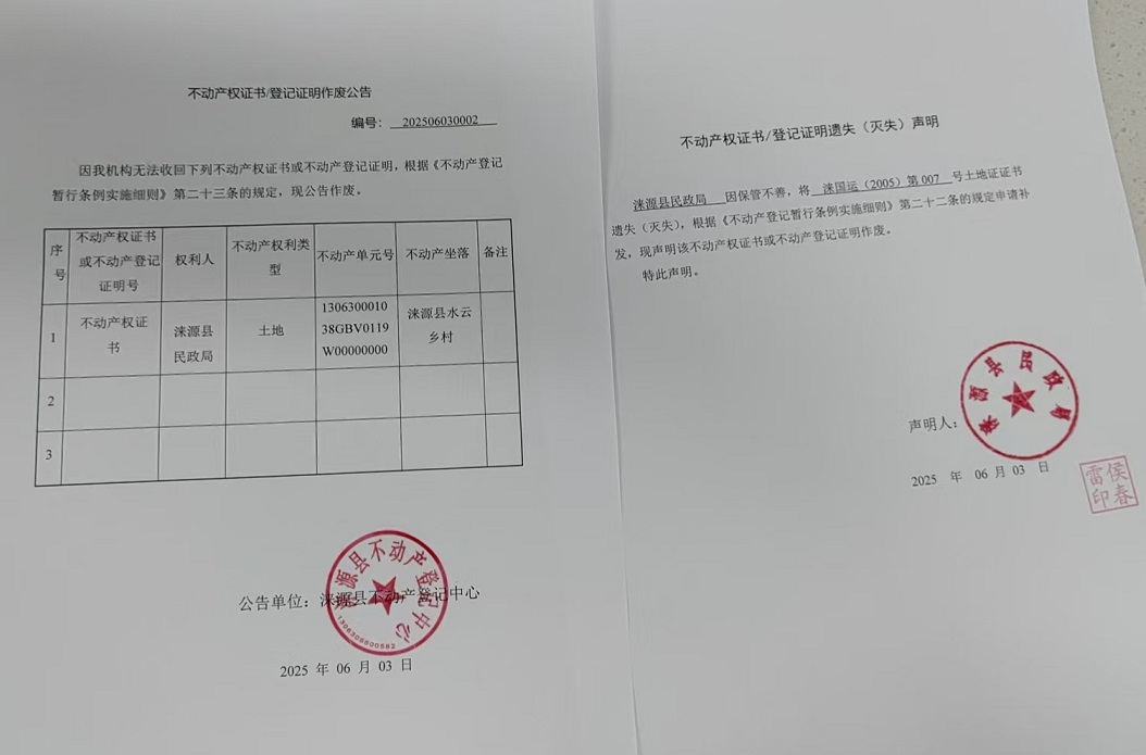 涞源县不动产登记中心不动产权证书作废公告