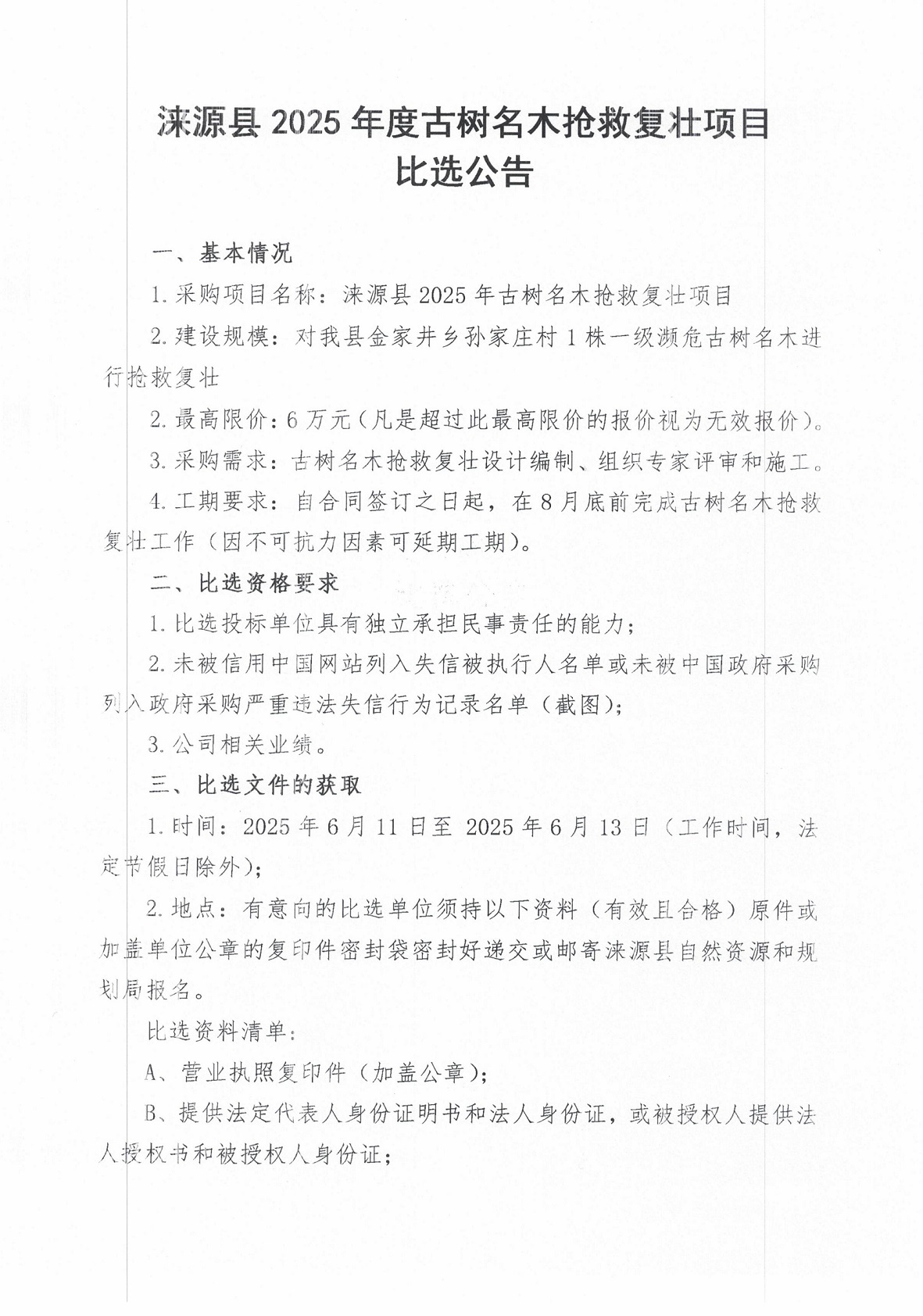 | 名 称: | 涞源县2025年度古树名木抢救修复状项目比选公告 | ||||
