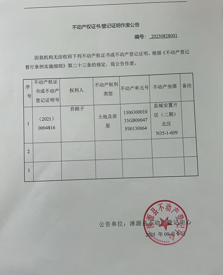 涞源县不动产登记中心不动产权证书作废公告