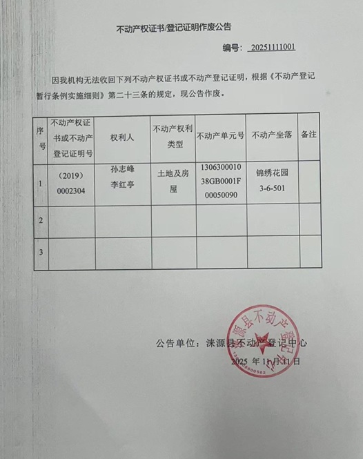 涞源县不动产登记中心不动产权证书作废公告