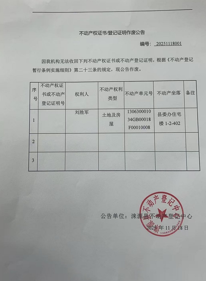 涞源县不动产登记中心不动产权证书作废公告