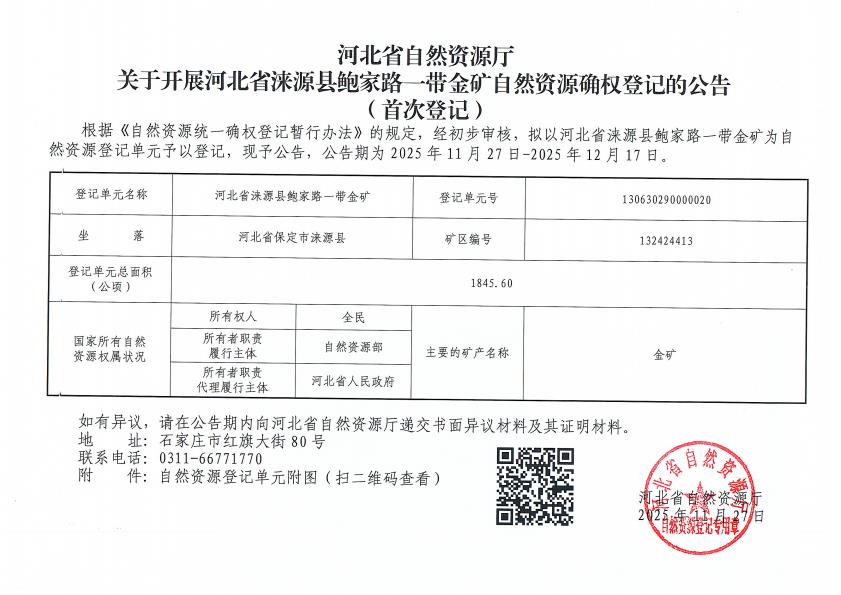 河北省涞源县鲍家路一带金矿自然资源确权登记(首次登记)