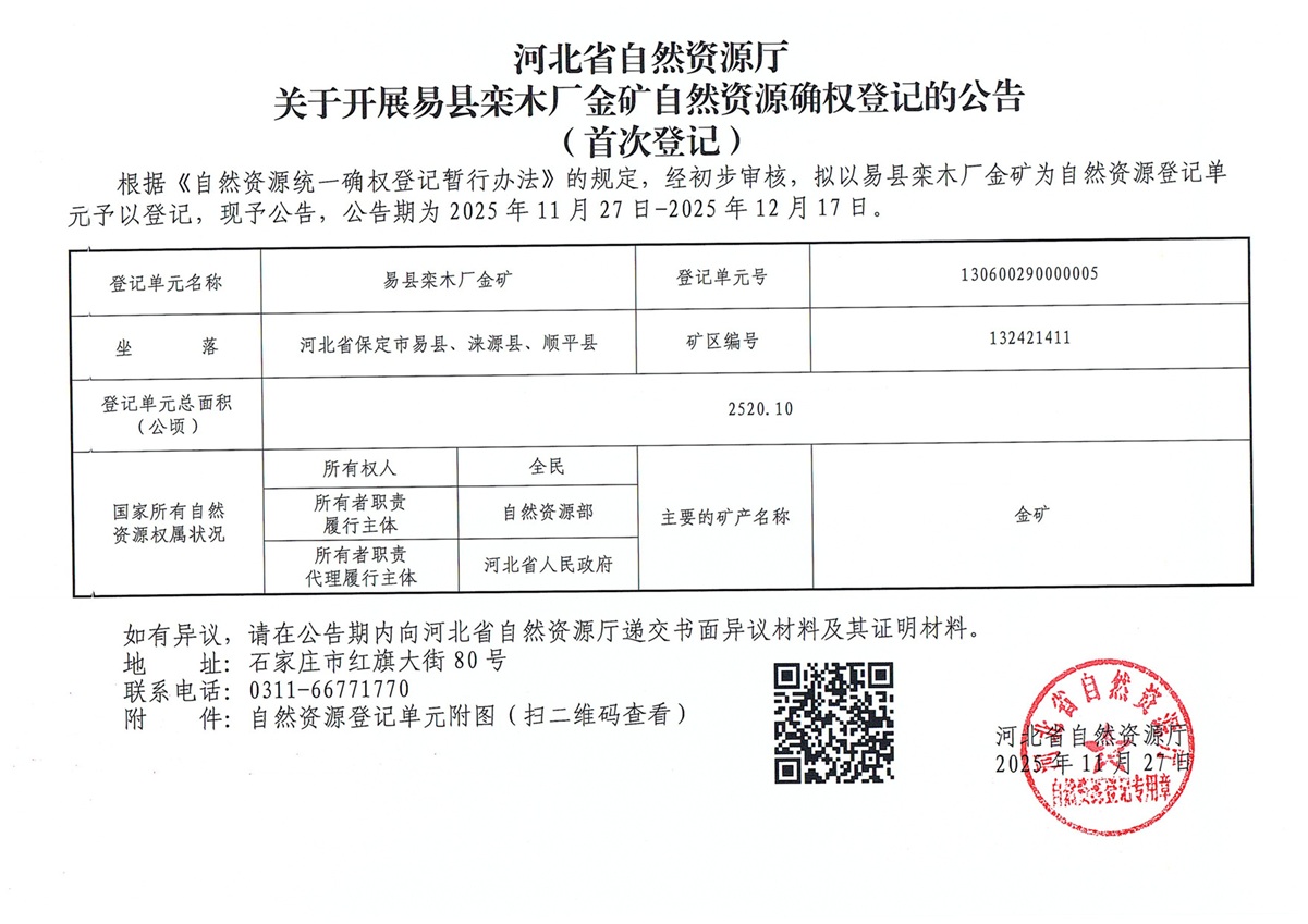 涞源县自然资源和规划局易县栾木厂金矿自然资源确权首次登记公告