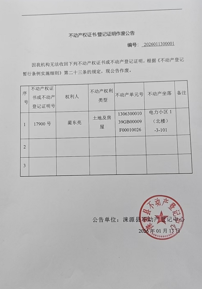 涞源县不动产登记中心不动产权证书作废公告