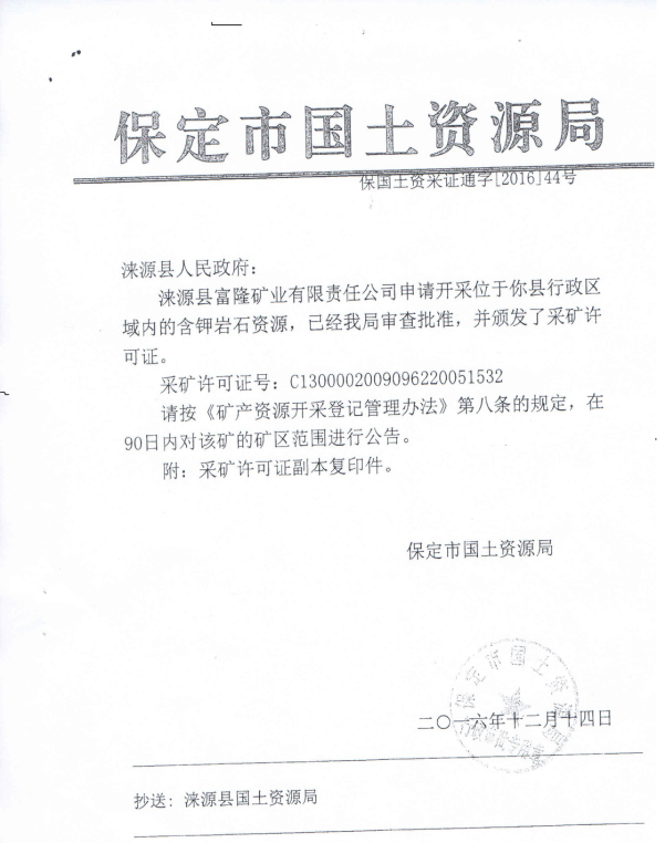 保定市国土资源局颁发采矿证许可证(变更)通知