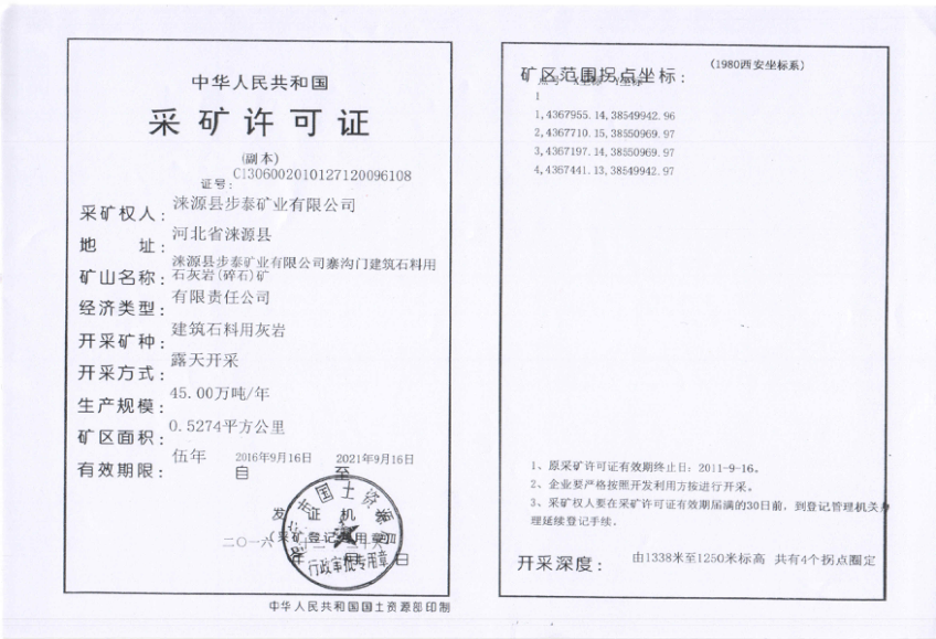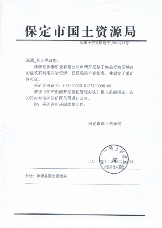 保定市国土资源局颁发采矿许可证(续证)通知