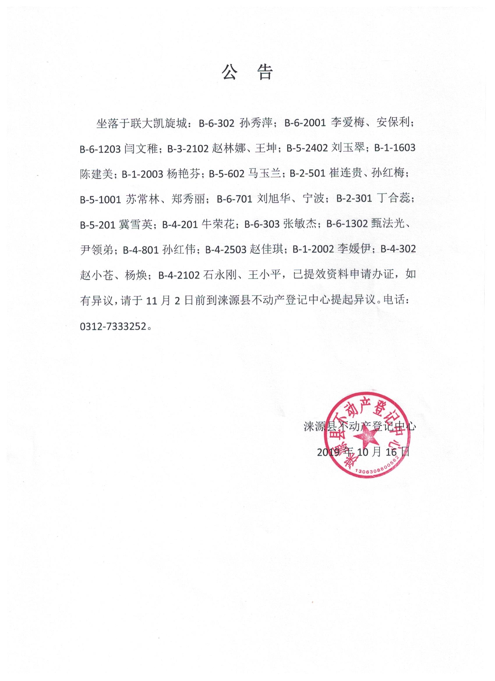 公告 坐落于联大凯旋城:B6302孙秀萍:B62001李爱梅、安保利;B-61203闫文稚;B-3-2102赵林娜、王坤;B52402刘玉翠:B-11603陈建美:B-12003杨艳芬:B-5602马玉兰;B2501崔连贵、孙红梅B5-1001苏常林、郑秀丽:B6-701刘旭华、宁波;B2-301丁合落B5201冀雪英;B4201生荣花;B6303张敏杰;B61302甄法光尹领弟;B4801孙红伟;B-42503赵雅琪:;B-1-2002李媛伊;B4-302赵小苍、杨块:日42102石永刚、王小平,已提效资料申请办证,如有异议,请于11月2日前到涞源县不动产登记中心提起异议。电话0312-7333252涞源县不动产登记中心 2019年10月16日 ![]() |