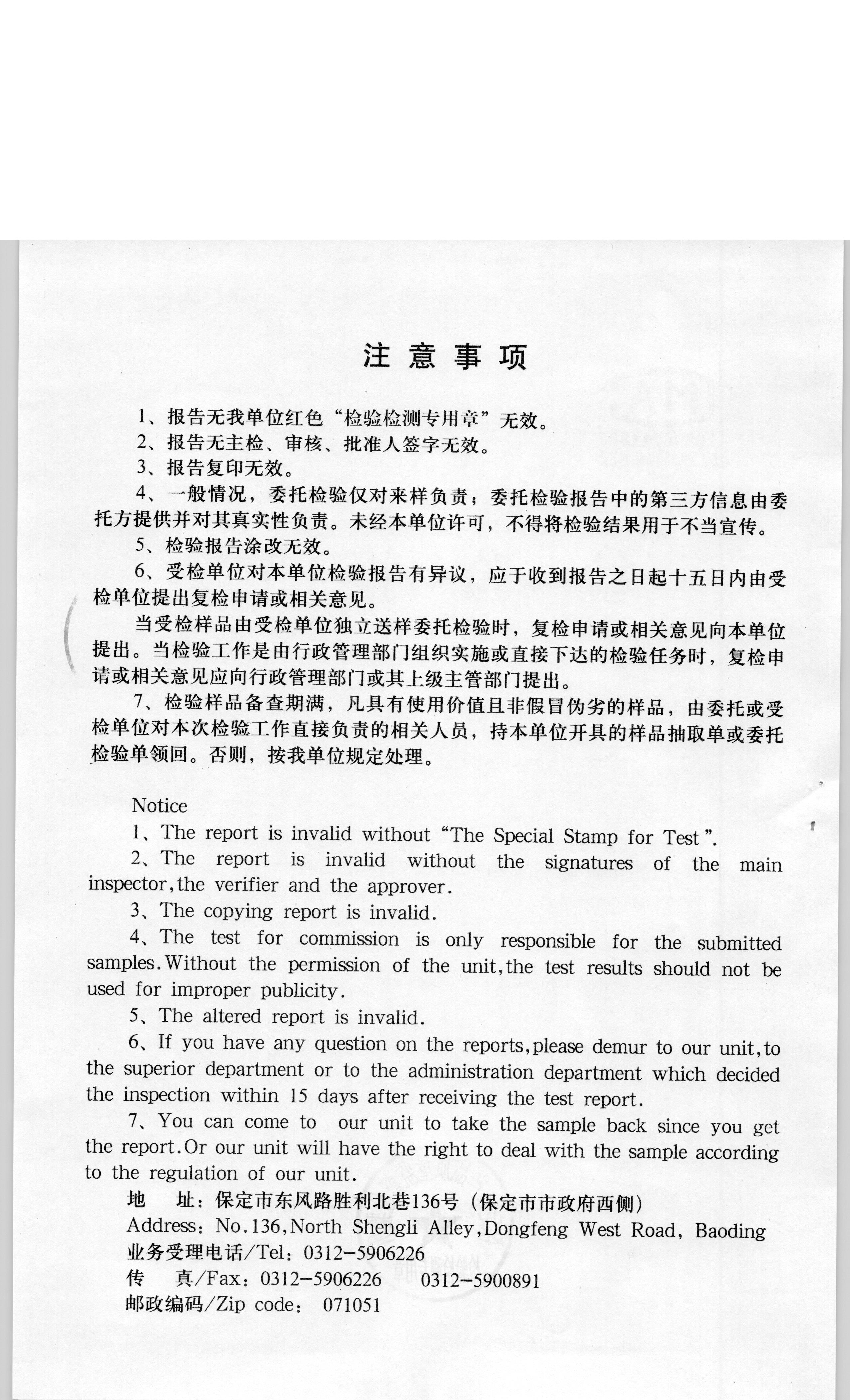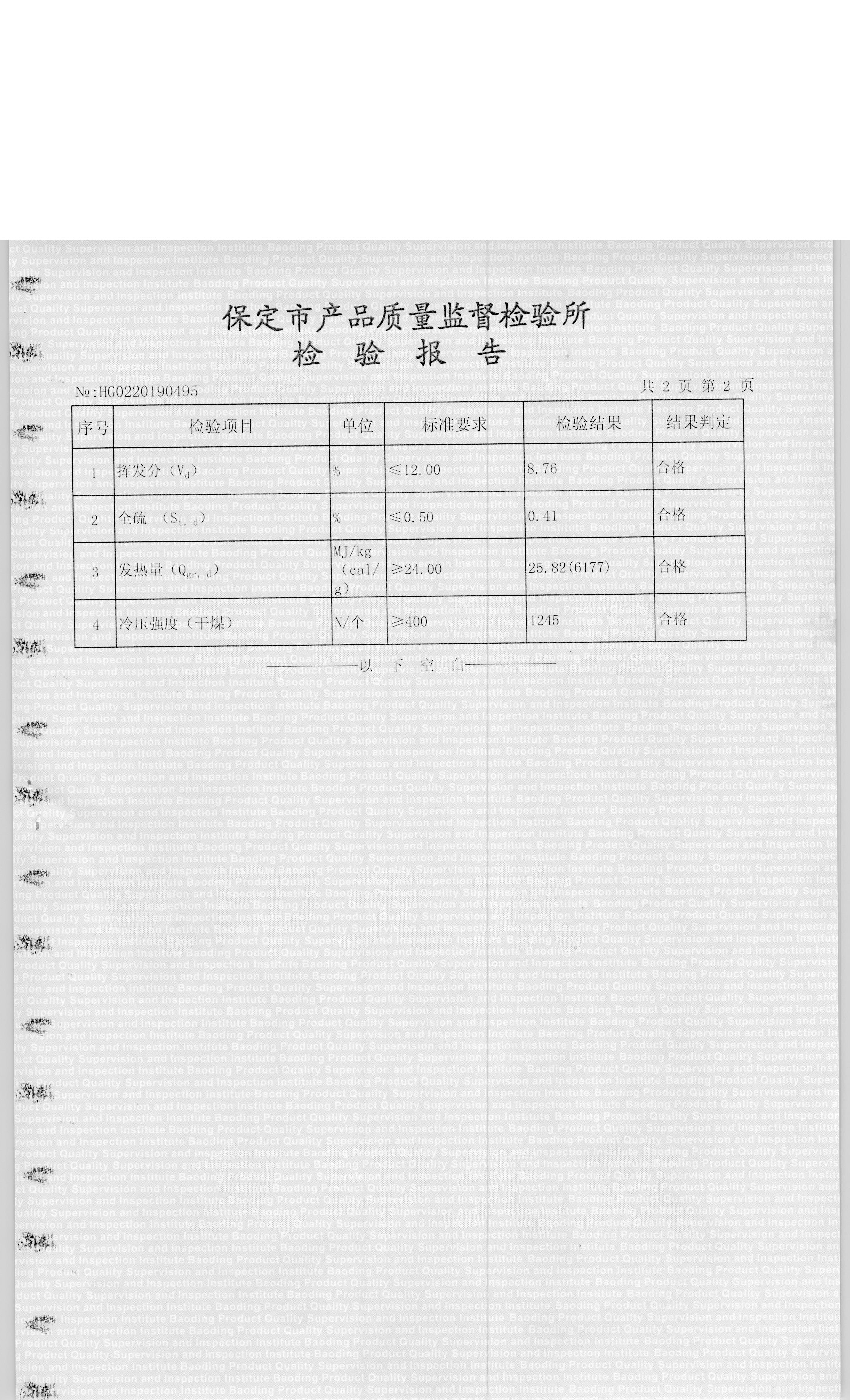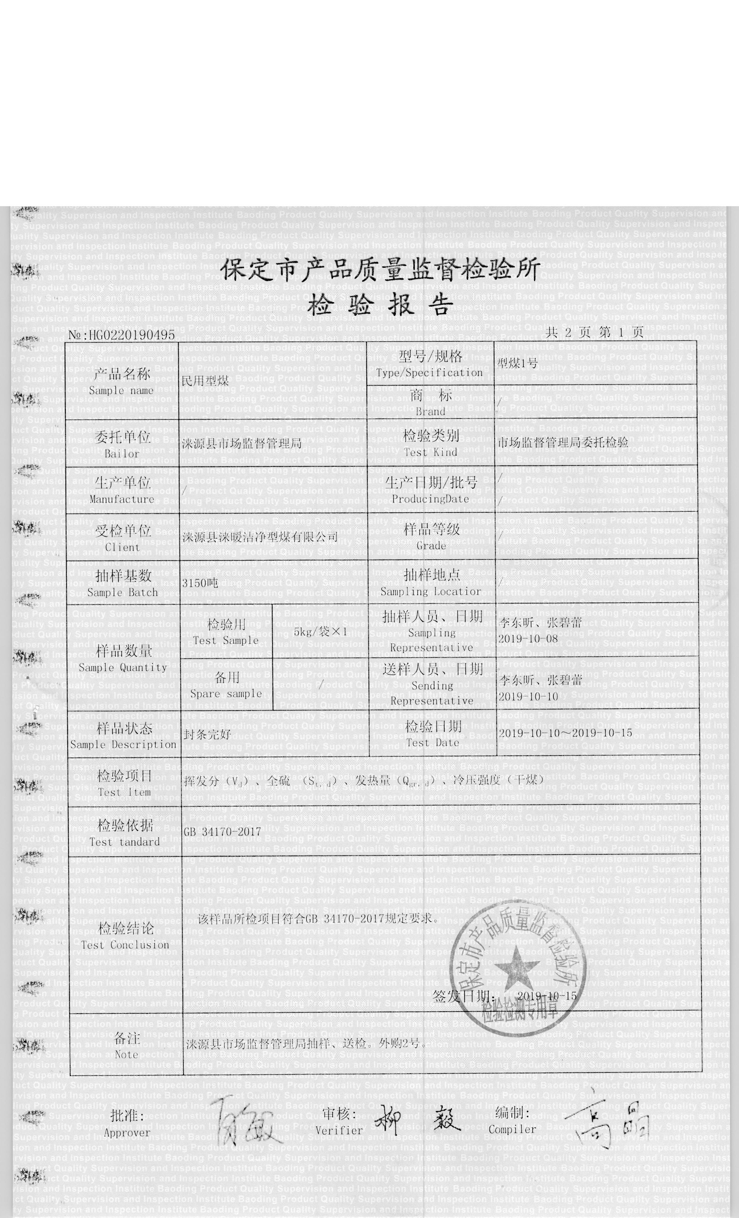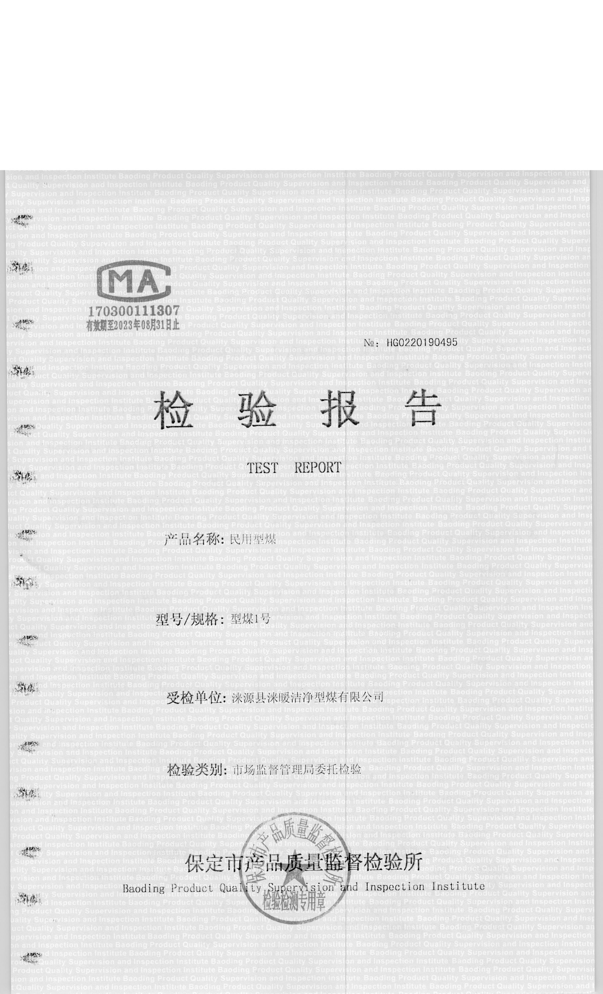 涞源县涞暖洁净型煤有限公司型煤1号检验报告