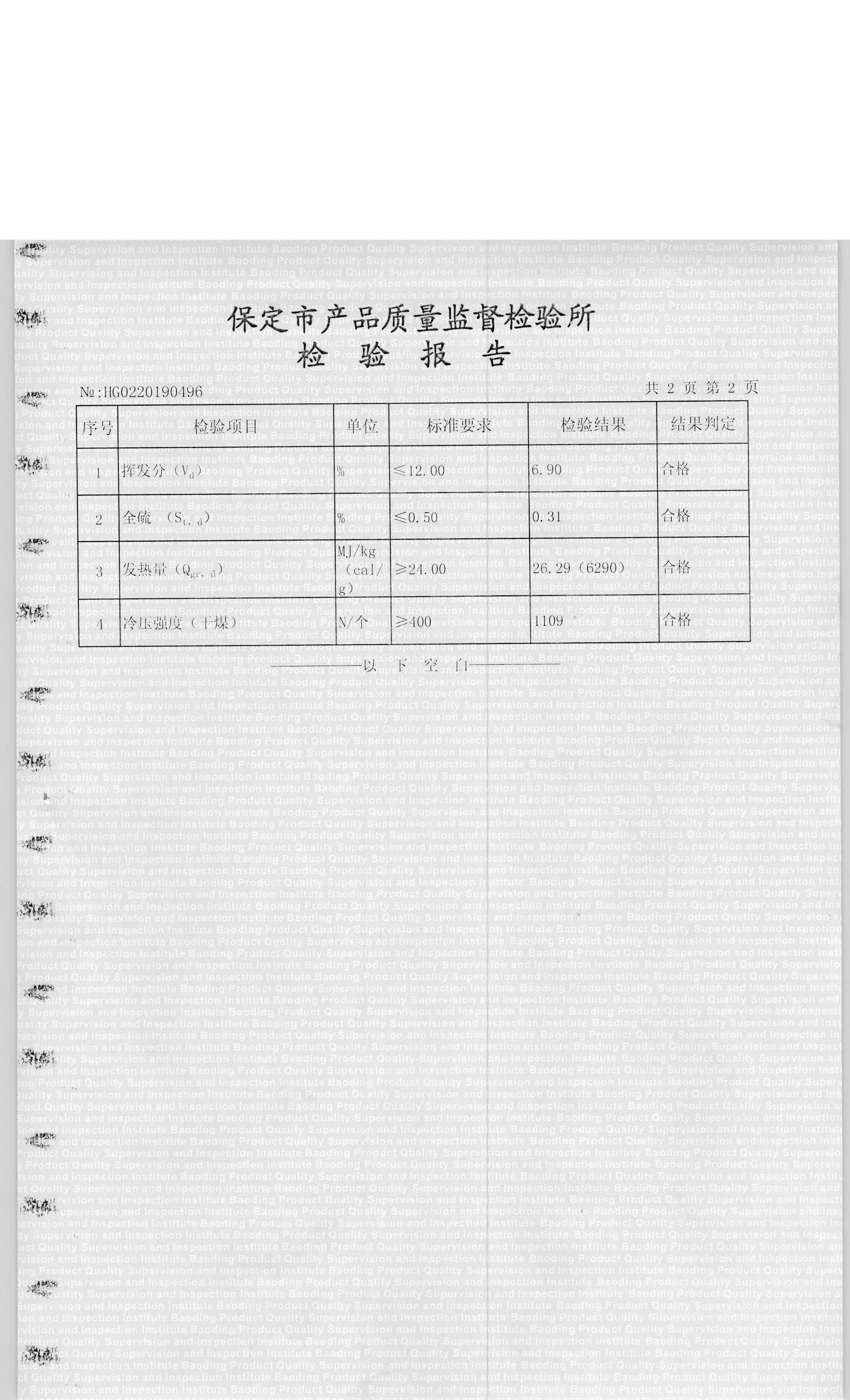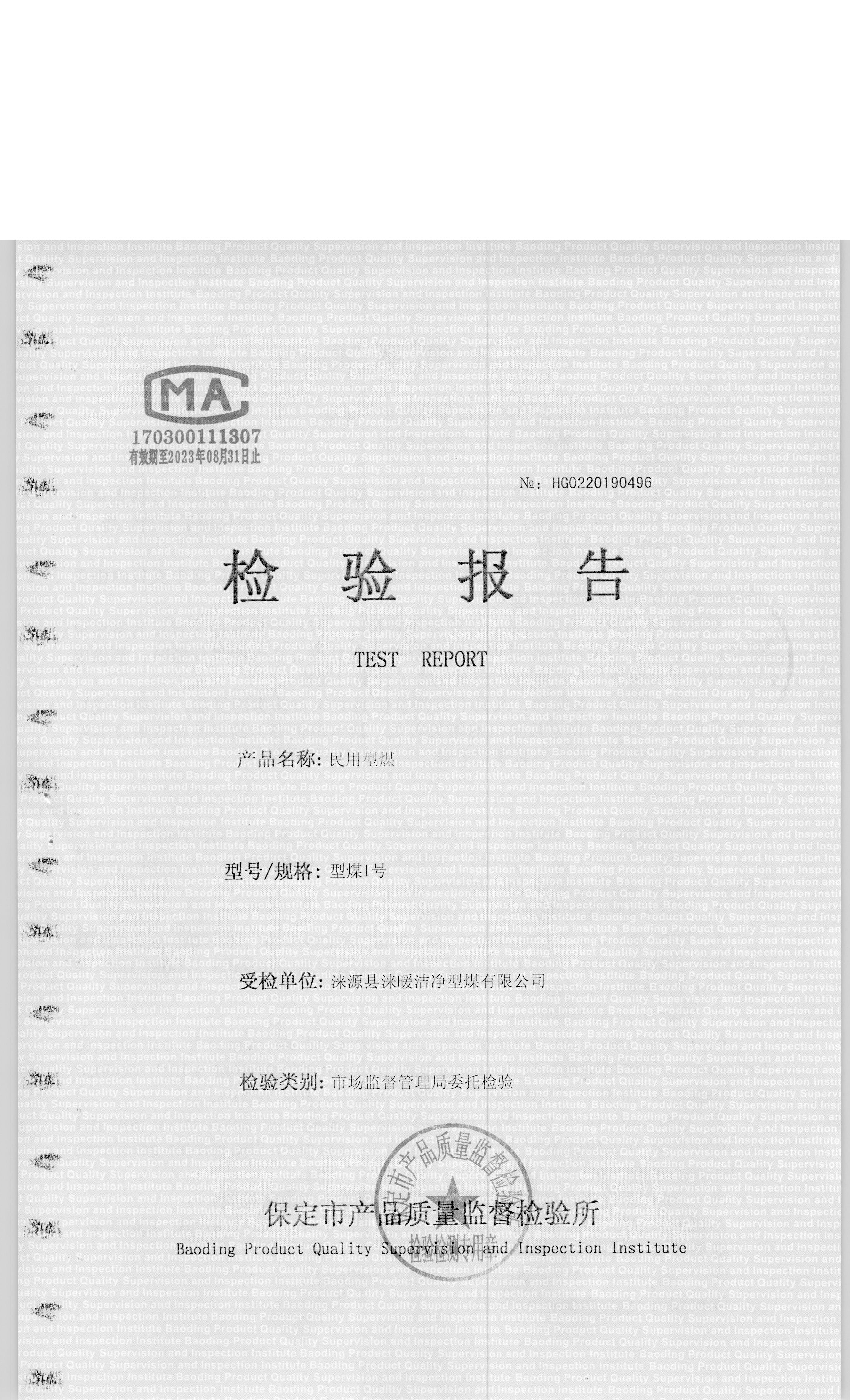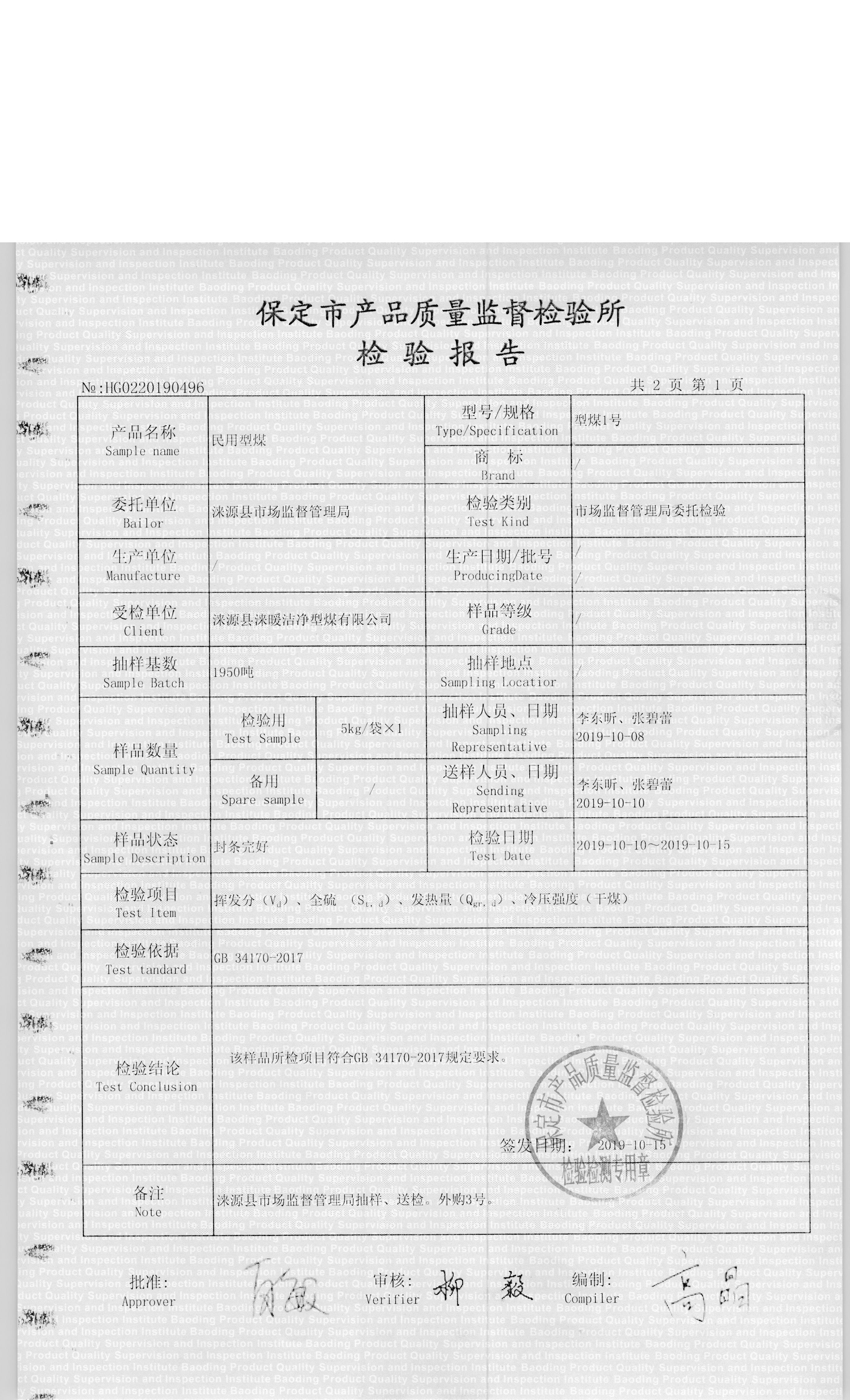 涞源县涞暖洁净型煤有限公司型煤1号检验报告