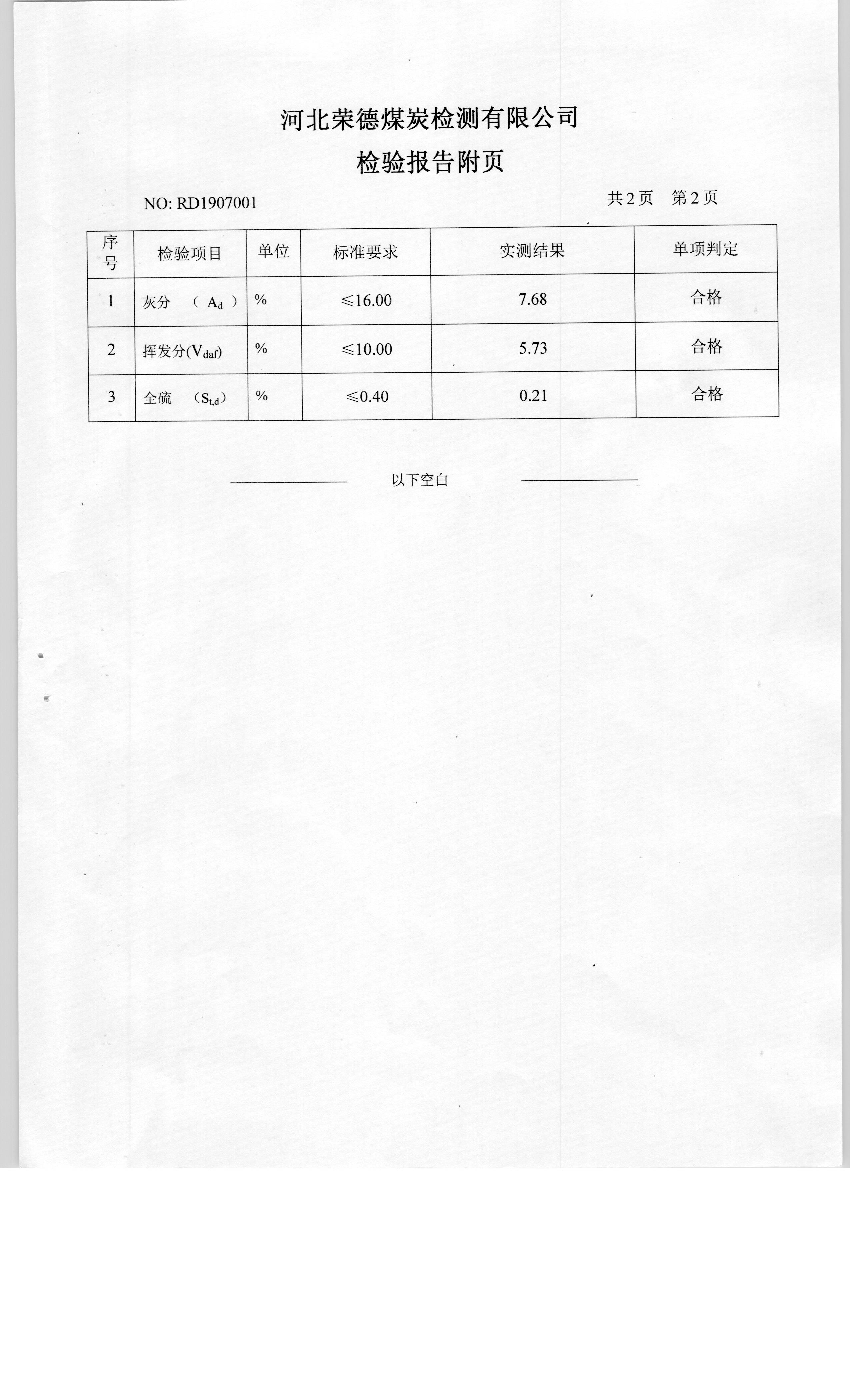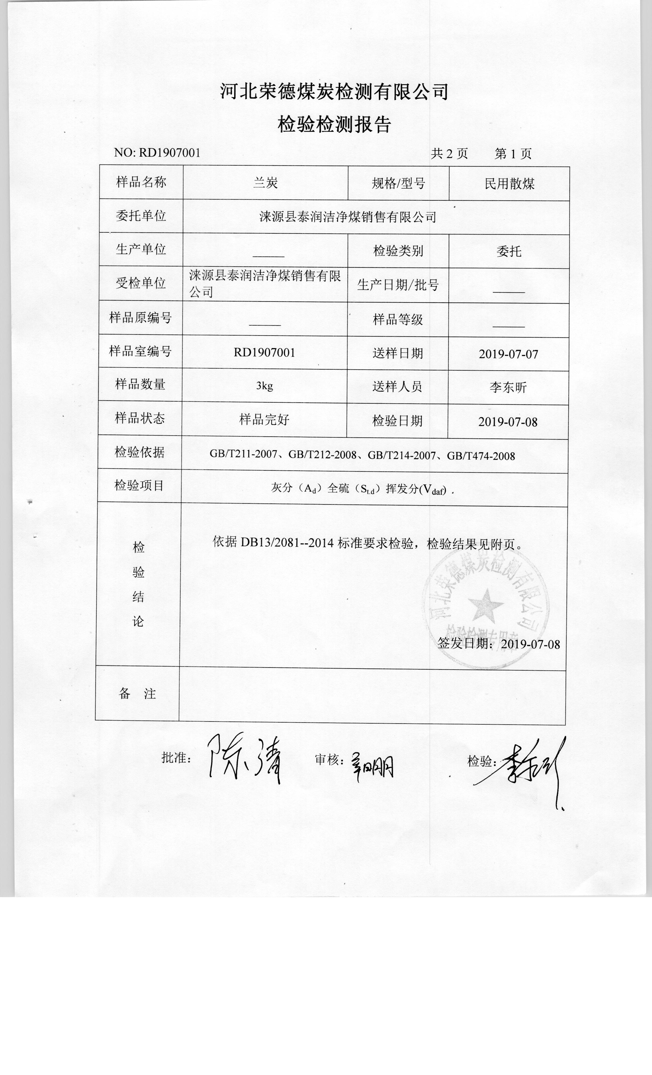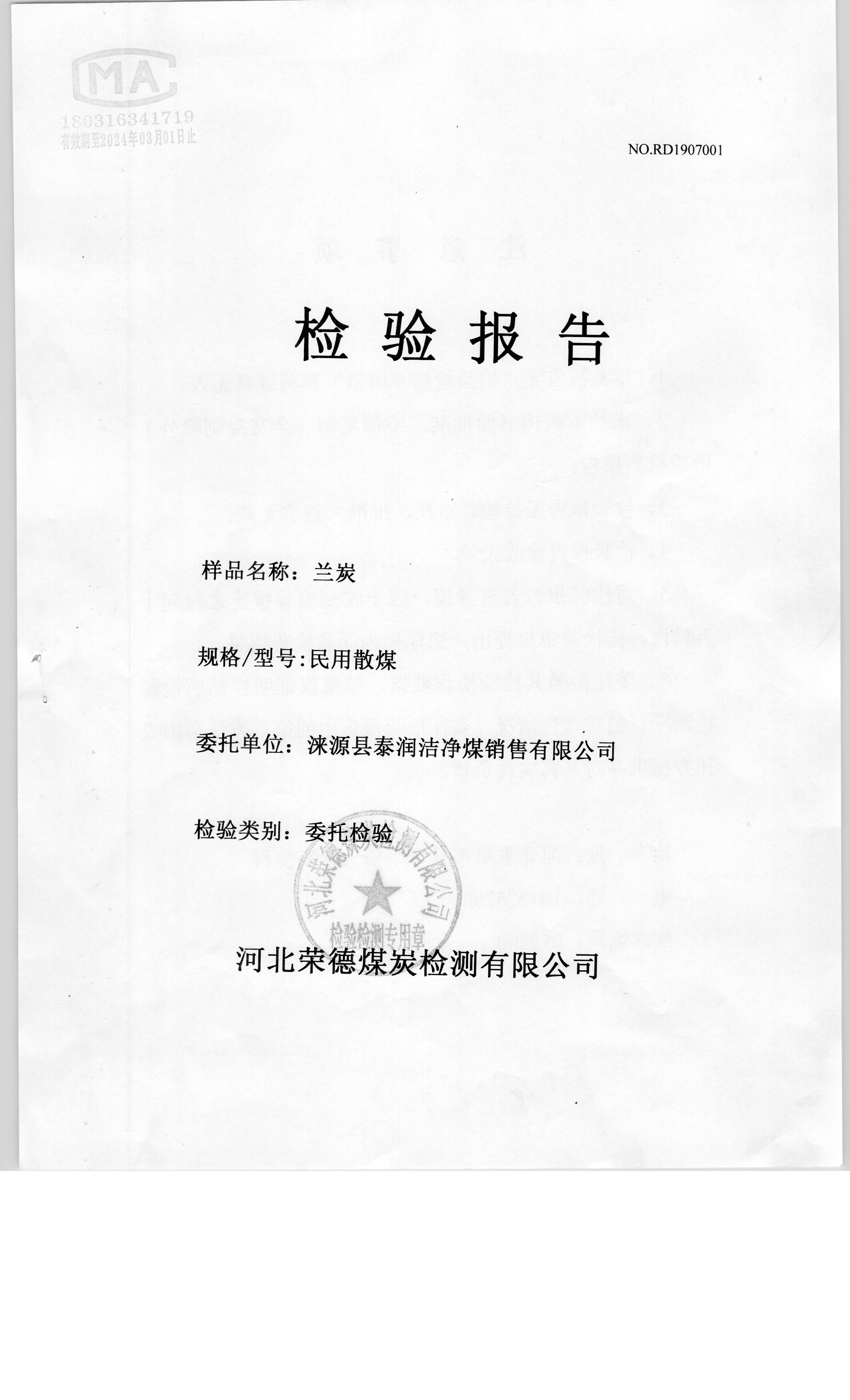 涞源县泰润洁净煤有限公司兰炭检验报告