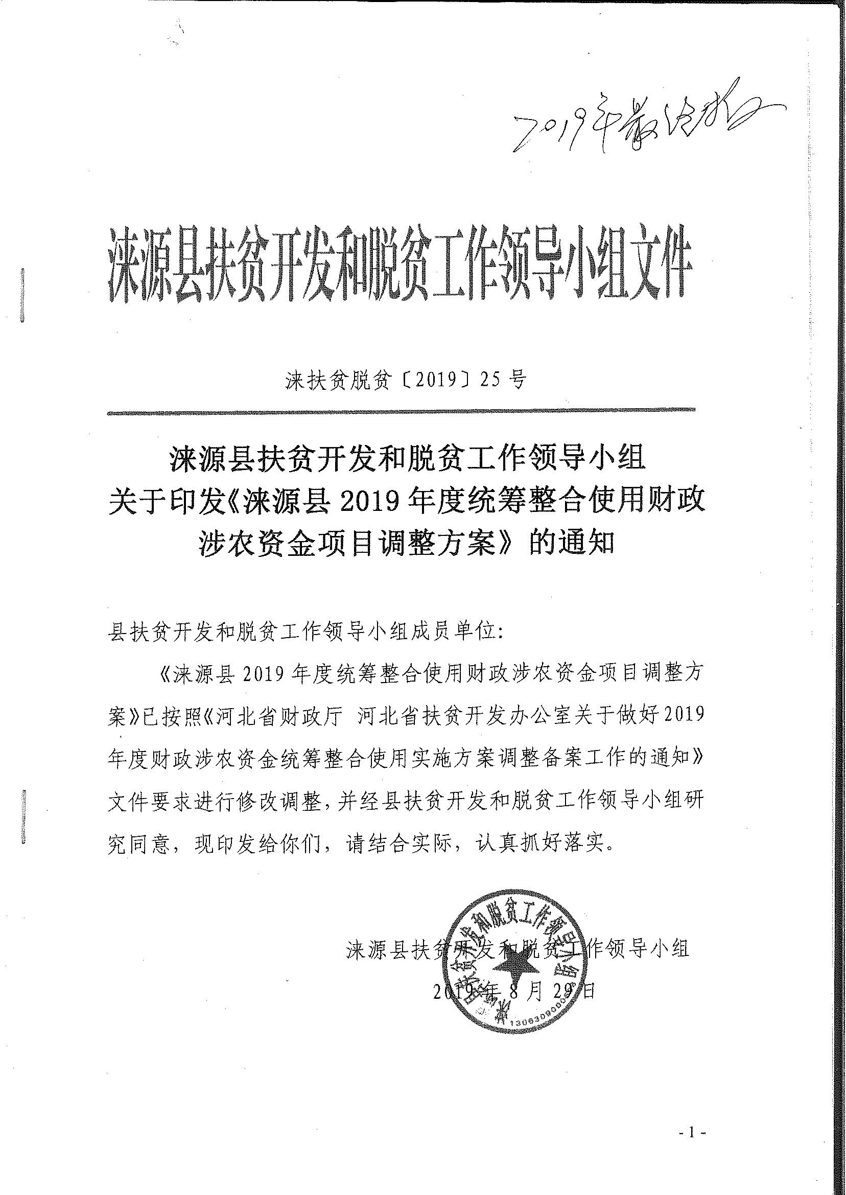 | 涞源县扶贫开发和脱贫工作领导小组关于印发《涞源县2019年度统筹整合使用财政涉农资金项目调整方案》的通知 | ||||