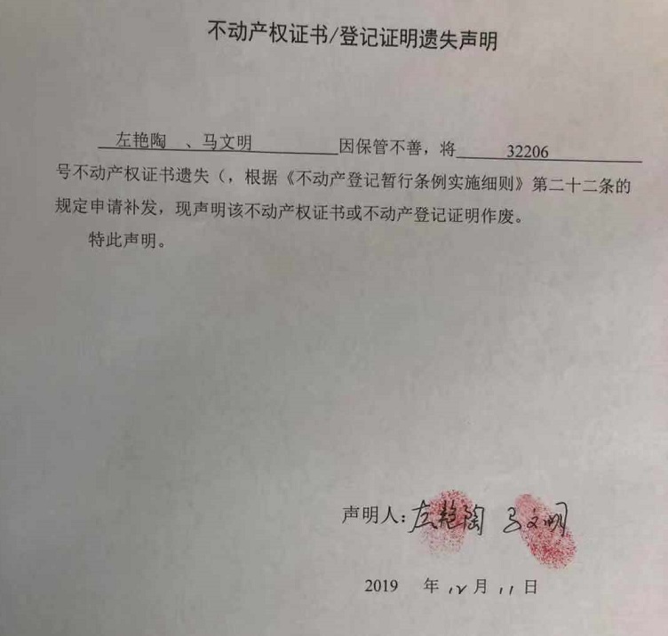 不动产权证书登记证明遗失声明